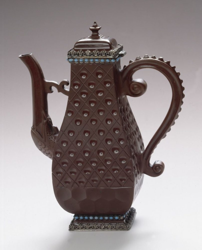 Außerhalb der Museen kursieren vor allem Böttgersteinzeug-Walzenkrüge und -Humpen, die braun gebrannt oder glänzend poliert und/oder mit eingeschnittenen Dekoren, mit Prunusreliefs oder mit eingearbeiteten Silbermünzen verziert sein können. Oft verfügen sie zudem über Zinn- oder kostbare Silbermontierungen. Kaffee- und Teekännchen folgen meist den zeitgenössischen Silberformen von Irminger. Die beliebte schwarze Manganglasur zahlreicher Gefäße veredelte der Hoflackierer Martin Schnell mit Lackfarben. Dank der Ausguss-Tüllen in Fischmaulform verschmelzen sie zu einer glücklichen Synthese chinesischer und europäischer Elemente.