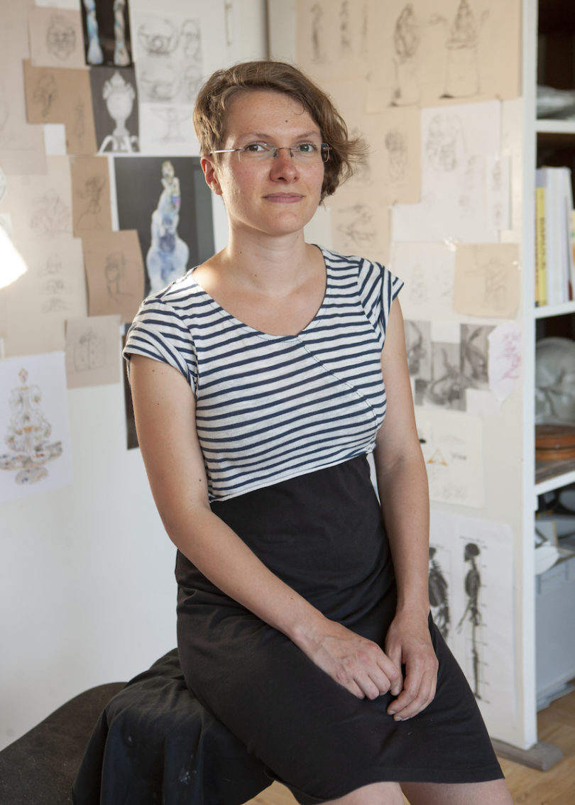 Maria Walthers Entwürfe entfernen sich noch stärker vom traditionellen Meissen-Repertoire. Vor der Meisterklasse hatte sie in Selb eine Ausbildung zur Produktdesignerin gemacht, die sehr „automobillastig“ gewesen sei. „Porzellan stand für mich nicht im Fokus, ich verband damit etwas Altes, Angestaubtes“, erzählt die 31-Jährige. Die Begegnung mit dem charismatischen Lehrer Danielczyk weckte in ihr die Leidenschaft für den Werkstoff. Sie habe durch ihn noch einmal „neu sehen gelernt“. Die Figuren, die sie heute für Meissen entwickelt, sind oftmals abstrahiert und bedürfen eines genaueren Blicks, wie etwa ihre Frauenskulptur „Geo“ mit ihrer dynamischen und sehr reduzierten Sprache.