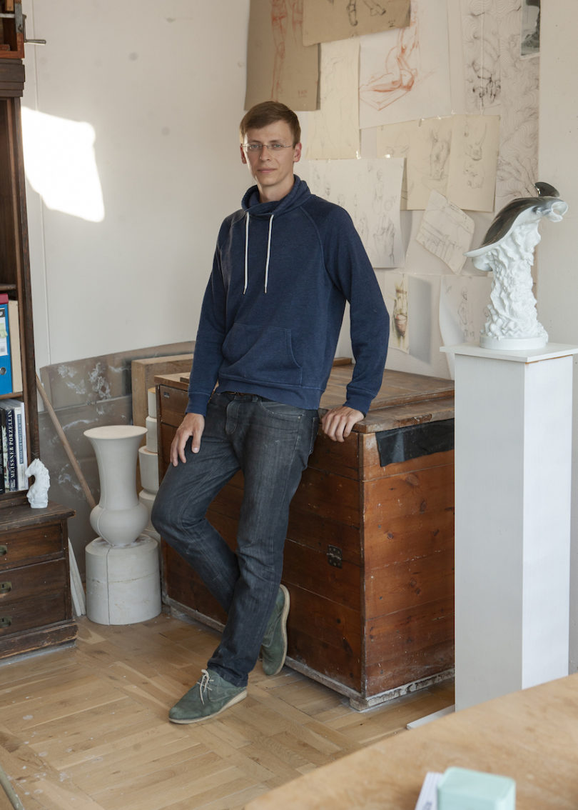 „Meine Handschrift muss sich erst noch entwickeln. Maria ist schon viel weiter.“ Maximilian Hagstotz spricht voller Respekt über seine fünf Jahre ältere Kollegin, mit der er sich das Atelier teilt. Dabei hat er mit seinen 26 Jahren schon eine Menge vorzuweisen. Nach der Realschule bewarb er sich bei Meissen und durchlief dort zunächst die mehrjährige Ausbildung zum Porzellanmaler – als einer von wenigen Männern unter vielen angehenden Malerinnen. Als er danach in die Meisterklasse von Jörg Danielczyk aufgenommen wurde, war klar, dass sein Weg in der Porzellanmanufaktur ein außergewöhnlicher wird. Dass er keine Teller oder Vasen bemalen, sondern Figuren schaffen würde. In den viereinhalb Jahren intensiven Studiums bei Meissens Chefplastiker hat er die Kunst der dreidimensionalen Darstellung von der Pike auf gelernt: vom Zeichnen und Modellieren übers Vergrößern und Verkleinern, die Grundlagen des Formenbaus und Brands bis hin zum fertigen Produkt.