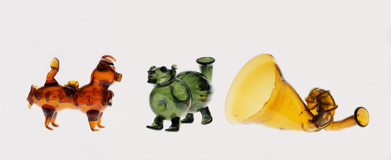 Schon in der Antike waren Scherzgläser für besonders fröhliche Trinkgelage gefragt. Motivvielfalt und Spezialeffekte machen die Glasgefäße zu spannenden Sammelobjekten