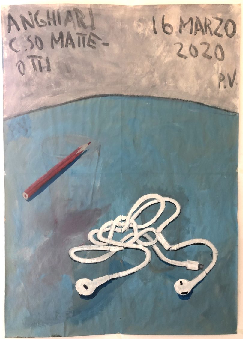 Gut. Na ja, ich werde irgendwie verrückt. Es ist wie ein Gefängnis. Ich bin hier in einer Ferienwohnung in einem alten toskanischen Kloster für zwei Wochen in freiwilliger Quarantäne, weil ich aus der „roten Zone“ Mailand komme. Da ich mein Equipment nicht hier habe, nur ein paar Farben und große Papierbögen, habe ich angefangen zu malen.