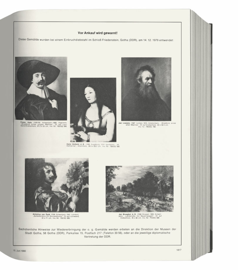 Eine ungewöhnliche Anzeige erschien im Juni 1980 in der WELTKUNST. Keine Annonce für eine Kunsthandlung oder ein Auktionshaus, sondern im Gegenteil die Warnung vor einem Ankauf. Fünf Ölgemälde waren auf der Seite abgebildet, das „Brustbild eines jungen Mannes“ von Frans Hals, eine „Heilige Katharina“ von Hans Holbein dem Älteren, das „Brustbild eines alten Mannes“ von Jan Lievens, eine „Landstraße mit Bauernwagen“ von Jan Brueghel dem Älteren und ein Anthonis van Dyck zugeschriebenes „Selbstbildnis mit Sonnenblume“. Ein lakonischer Satz begründete die Warnung: „Diese Gemälde wurden bei einem Einbruchdiebstahl im Schloß Friedenstein, Gotha (DDR), am 14.12.1979 entwendet.“ „Sachdienliche Hinweise zur Wiedererbringung“ der Gemälde solle man an die Direktion der Museen in Gotha oder an eine diplomatische Vertretung der DDR geben.