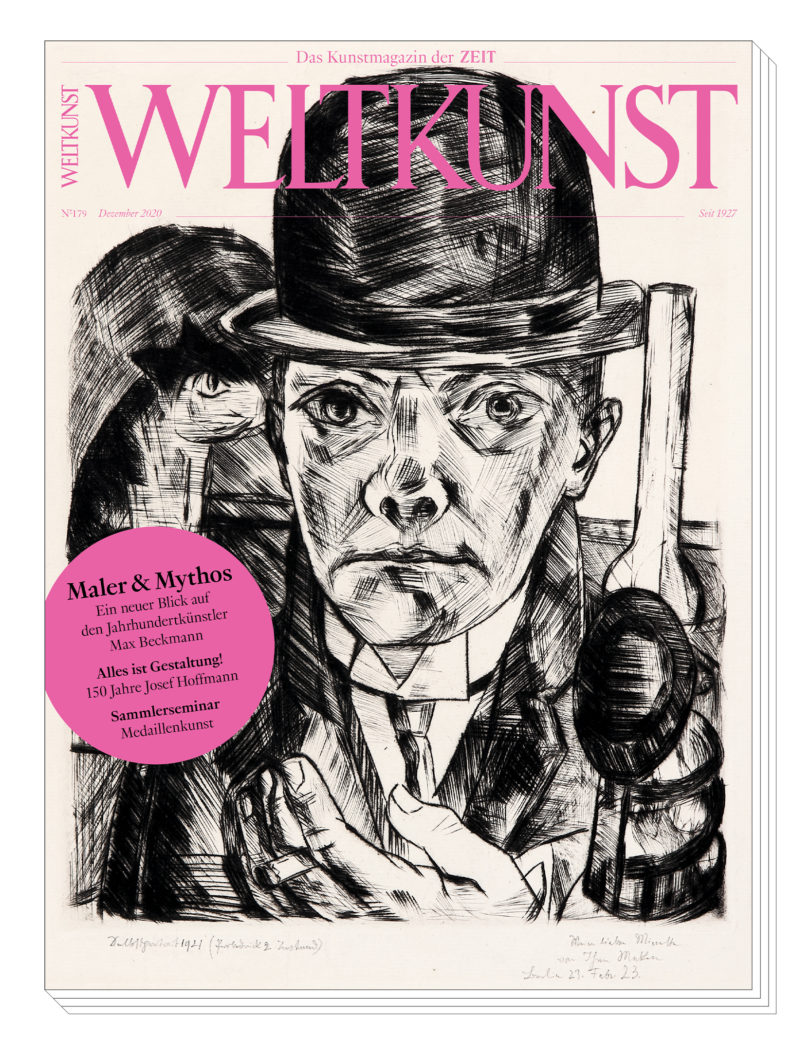 Die Dezemberausgabe der Weltkunst mit Max Beckmanns „Selbstbildnis mit steifem Hut", 1921. © Privatbesitz Deutschland/VG Bild-Kunst, Bonn 2020. Foto Alistair Overbruck, Köln