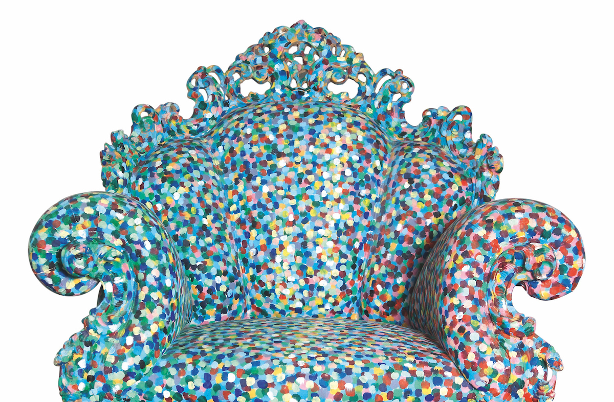 In den beiden Jahrzehnten zuvor waren die nonkonformistischen Ansätze in Italien schon deutlich zu spüren, und auf der Suche nach neuen Perspektiven herrschte in den Sechzigern und Siebzigern eine wilde Gemengelage an industrie- wie konsumkritischen Theorien und Designerkollektiven. Eine Ikone des Radical Design ist das Sitzobjekt „Pratone“ der Gruppe Strum aus dem Jahr 1970, bei dem man, wenn man sich traut, in einer Reihe von überdimensionierten Schaumstoffgrashalmen versinkt. Der so farbenprächtig, in pointillistischer Manier bemalte und ironisch-humorvoll daherkommende Neobarocksessel „Poltrona di Proust“ von 1978 war dagegen Alessandro Mendinis Ausdruck einer eher pessimistischen Einstellung zur Zukunft des Designs: Für ihn war zu diesem Zeitpunkt alles schon erdacht und somit nur ein Re-Design von berühmten Objekten oder objets trouvés möglich. Zusammen mit Alessandro Guerriero prägte Mendini mit seinen Ideen und Entwürfen die Gruppe Studio Alchimia, der auch Sottsass angehörte, bevor er 1980 dort ausstieg.