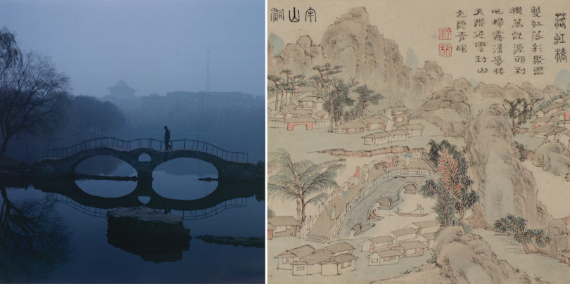 In einem aber bleibt auch die topografische Malerei klassisch. Denn niemals wird sie fotografisch, sondern hält sich weiter an die Grundsätze der Landschaftsdarstellung mit Tusche, bleibt also ohne Zentralperspektive, archaistisch verfremdet und bewusst „künstlich“ im Sinne der Gelehrtentradition. Die Heutigen knüpfen an dieses Genre an, wenn auch sie konkreten Orten eine besondere Bedeutung beilegen. Hai Bos Fotoarbeit „Blue Bridge“ von 2004 beispielsweise zeigt eine altertümliche, im Fluss sich spiegelnde Steinbogenbrücke, die in einen Park führt. Alles ist blau, still und ewig, aber im Hintergrund recken sich bereits die Telegrafenmasten Changchuns, eine unter Chinas stürmisch wachsenden Städten, die inzwischen Hai Bos melancholisch erinnerte Stadtrandidylle aufgefressen haben wird. Ein anderes Beispiel bietet Huang Junbi. Seine „Uferlandschaft“ stammt aus dem Jahr 1939: ein Dorf, gelegen hinter einem Fluss und Bäumen – ganz gemäß malerischem Schema –, bloß dass riesige Rauchschwaden daraus aufsteigen. Huang wählte den Augenblick der Zerstörung des Ortes. Die Japaner hatten gerade Chongqing bombardiert und den Rest ihrer Bombenlast in die Landschaft geworfen.