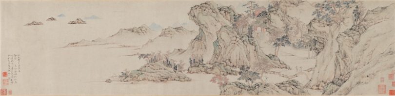 Jahrhunderts etwas sehr Modernes: der Tourismus. Eine unbändige Reiselust erfasst Gelehrte, Kaufleute, Mönche. Es zieht sie in die sagenumwobenen Regionen der Gelben Berge, aber auch zu den Sehenswürdigkeiten am Rande der Städte. Chen Guan (1563–1639) malt „Reisende in den Bergen“, Mei Qing (1624–1697) „Berühmte Ansichten von Xuanchen“, Lu Zhi seine meisterhafte Querrolle „Das Lied vom Großen Lande Wu“, in der er 1534 den Steinsee in der Nähe von Suzhou porträtiert, mit dem Zhiping-Kloster am Ufer, einem beliebten Ausflugsort, wo schon bald ein viel beklagter Rummel tobt.