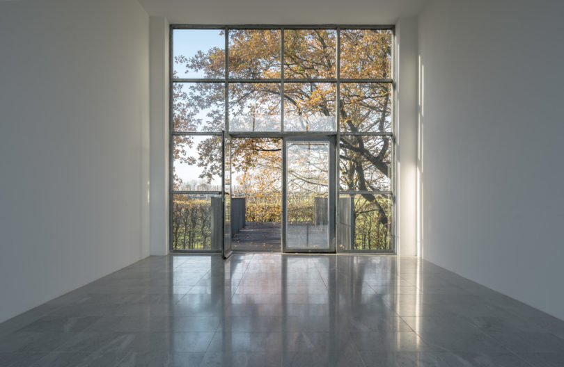Kaum ein Gebäude macht die Idee so transparent wie der „Turm“ des Bildhauers aus den späten Achzigerjahren, den man vom Kassenhaus als Erstes erreicht. Vier gläserne Öffnungen in alle Himmelsrichtungen ermöglichen den Ein- und Ausgang. Zu sehen gibt es vermeintlich nichts, der scharf eingeschnittene Kubus mit Oberlicht ist vollkommen leer. Bis auf die Impressionen von wogenden Gräsern und dichten Büschen, die durch die Glastüren sichtbar werden. Der „Turm“ als transitorischer Ort soll die Sinne schärfen, einstimmen auf die Begegnung mit Natur, Architektur und Kunst.