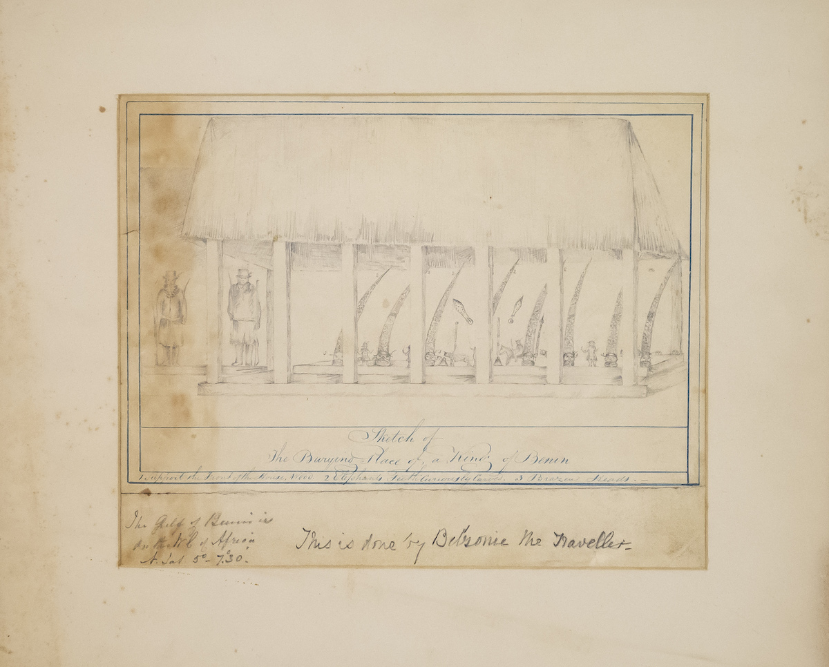 Kurz nachdem ich 2019 mein Amt als Direktorin des Museums Rietberg in Zürich angetreten hatte, nahm ich an einer Kuratoriumssitzung teil, bei der mögliche Ankäufe diskutiert wurden. Ich traute meinen Augen kaum, als als Erstes ein Blatt von 1823 vorgestellt wurde mit dem Titel „Sketch of the Burying Place of a King of Benin“. Das Blatt wird dem Ingenieur und Archäologen Giovanni Battista Belzoni (1778 – 1823) zugeschrieben und sollte nur wenige Tage später zur Auktion kommen. Die Skizze zeigt einen königlichen Ahnenschrein in Benin-City, im heutigen Nigeria. Der Altar versammelt – beeindruckend inszeniert – die bedeutendsten Gelbgussobjekte und Schnitzereien aus den höfischen Werkstätten eines Königs von Benin. Ins Auge fallen vor allem die geschnitzten Elfenbeinzähne auf Gedenkköpfen, von denen etliche im Zuge der Strafexpedition der Briten 1897 nach Europa gelangten. Die Zeichnung war prägend für mich, ich kannte sie bis dahin jedoch nur aus der Forschungsliteratur.