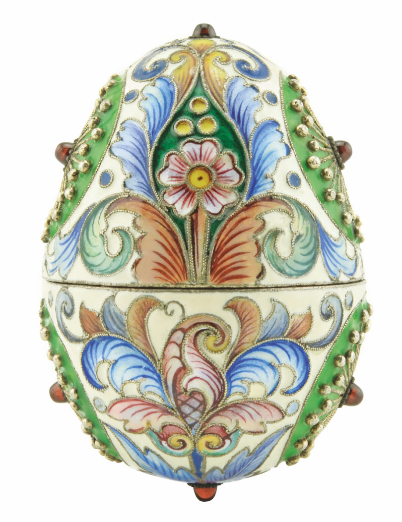 Die Pastelltöne der St. Petersburger Paläste im Sonnenuntergang, das modische Mauve aus dem Malvenboudoir der Kaiserin, irisierendes „Austern-Email“: Fabergé hatte bis zu 140 Farbschattierungen und alle Arten des Emaillierens zu bieten – vom Champlevé (Grubenschmelz) über das lichtdurchlässige Plique-à-jour (Fensteremail) bis zum Cloisonné (Zellenschmelz). Zu erwähnen sind hier vor allem die Moskauer Cloisonné-Arbeiten Fedor Rückerts im altrussischen Stil – echte Objekte der Begierde für die russischen Puristen unter den Fabergé-Liebhabern.