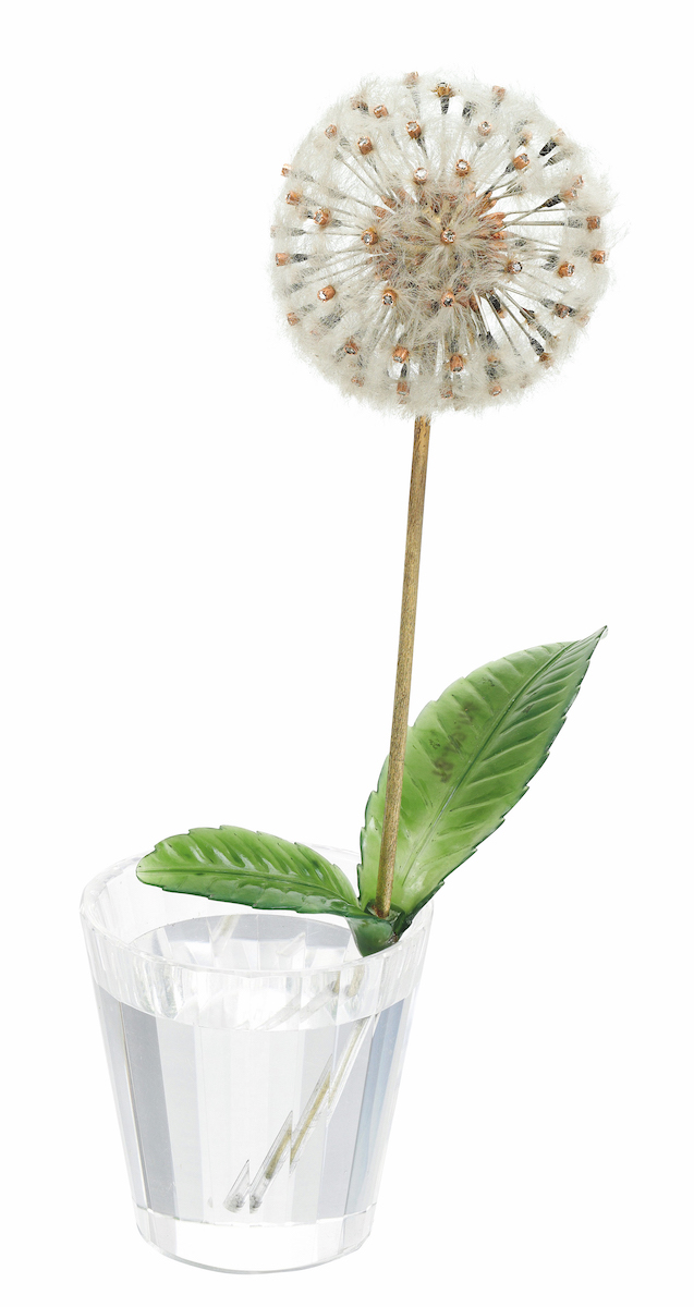 Im Grunde handelte Fabergé mit Emotionen. Russland war das Land ausschweifender Opulenz, etwa in Form mannshoher Malachit-Vasen, aber er lieferte die Accessoires für einen sehnsuchtsvollen Boudoirstil, der in den langen Wintermonaten die Natur und die Leichtigkeit ins Haus holte. Heute müssen Fans dieser Pflanzenstudien tief in die Tasche greifen. Eine Pusteblume aus der Sammlung des Brooklyn Museums verdoppelte im Dezember bei Sotheby’s London mit brutto 462 700 Pfund die Taxe. So täuschend echt umwölken flaumige Fäden die in Roségold gefassten Rosenschliff-Diamanten, dass man gern an ihnen zupfen würde (besser nicht, denn sie sind aus Asbestfasern).