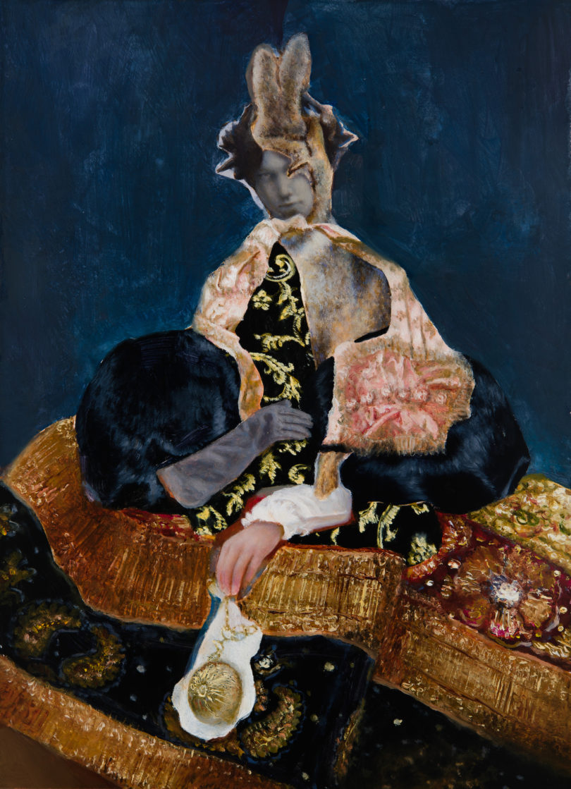 Mit ungewöhnlich kostümierten Figuren entführt Teodora Axente den Betrachter in eine edle, aber beunruhigende Welt – wie das kleine Ölbild „Deer Eye“ aus dem Jahr 2019 vorführt. © Gallery Rosenfeld, London
