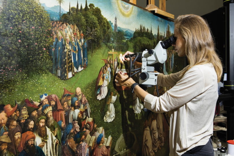 Damit könnte die Geschichte eigentlich schon enden. Bevor der Altar aber endgültig an dem Platz zur Ruhe kommen konnte, für den er einmal erschaffen wurde, stand ihm noch einiges bevor. Er wurde gestohlen, verkauft, versteckt, verschleppt, zurückgeholt und mehrere Male beinahe zerstört: Während der Französischen Revolution verschleppten Soldaten den Mittelteil des Altars nach Paris, 1821 kaufte der preußische König die Seitentafeln von einem englischen Sammler für die künftige Gemäldegalerie in Berlin, und im Zweiten Weltkrieg konfiszierten die Nationalsozialisten das Meisterwerk neben vielen anderen für das geplante Führermuseum. Immer kehrte das Lamm Gottes zurück nach Gent, war aber auch hier von Bilderstürmern, Dieben und Bränden bedroht. Und von übereifrigen Restauratoren, die den Altar Schicht um Schicht mit Übermalungen und Firnis beinahe unkenntlich machten.