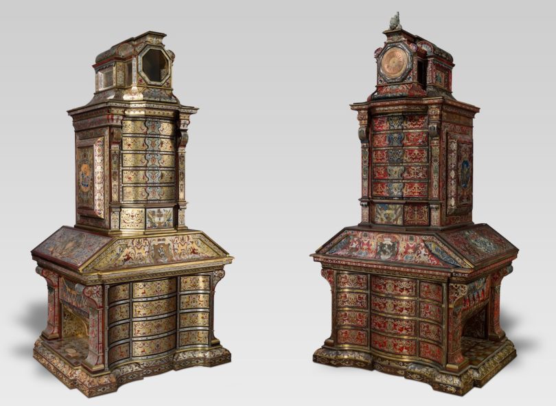 Singuläre, genuin Münchner Höhepunkte sind die beiden drei Meter hohen Doppelschreibschränke, die Kurfürst Max Emanuel bereits 1704 vor seiner Flucht nach Belgien bei seinem „Hof- und Galanteriekistler“ Johann Puchwiser vermutlich für Schloss Schleißheim in Auftrag gab und erst nach seiner Rückkehr aus dem Exil 1715 abnehmen konnte. Man geht davon aus, dass sie als Gegenstücke für eine bestimmte Raumsituation geplant waren. Über einem mächtigen Kommodenunterbau finden sich seitlich schräge Pultklappen, während der Mittelteil einen drehbaren Tabernakelkasten mit dreifachen Verwandlungsmechanismen aufweist. Alle Schauseiten sind vollständig mit Boulle-Marketerien aus Schildpatt, Messing, Kupfer, Zinn und Horn überzogen. Wobei Puchwiser das Schildpatt rot hinterlegte und so zum Leuchten brachte, ebenso das blau hinterfangene Horn, das dadurch wie Lapislazuli schimmert.