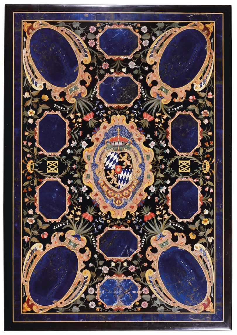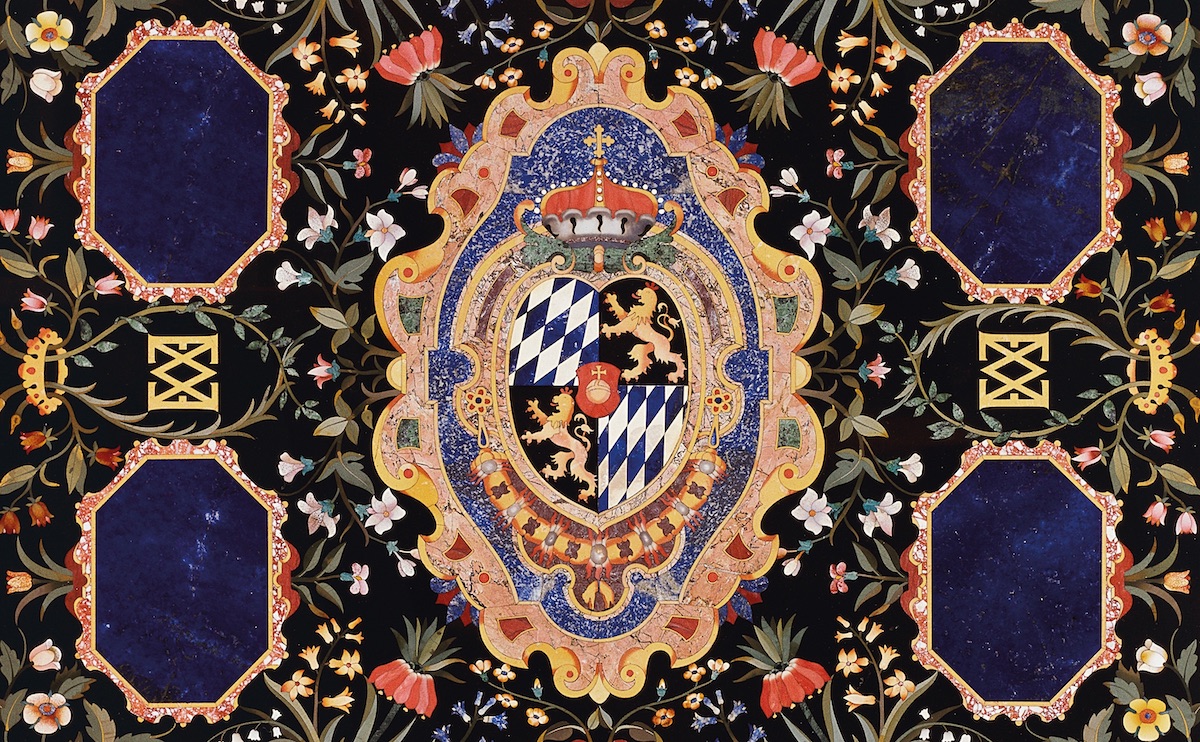 Mit diesem Marmor-Surrogat, das die Inkrustationen antiker Kaiserpaläste nachahmte, stattete man Maximilians Privatoratorium ebenso aus wie Kabinette oder Türrahmen und erstmals auch Möbel. Und dann gab es noch die Pietra dura, die damals hochgeschätzt war. Für die Einlegearbeiten aus edlen Steinen fehlten in Bayern die Materialvorkommen. So orderte der Hof die Platten aus Prager und Florentiner Werkstätten, die mit hiesigen Gestellen kombiniert wurden. Ein herrliches Beispiel dafür ist der Prunktisch, der nach 1623 in Florenz gefertigt wurde, mit zwölf großen Lapislazuli-Einlagen, feinem Blumendekor und dem kurfürstlich-bayerischen Wappen im Zentrum.