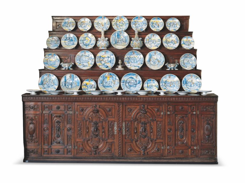 Besonders viele hochkarätige Stücke haben sich im Residenzmuseum erhalten, darum beginnen wir in dem weitläufigen Schloss mit unserem Streifzug durch die Möbelkunst. Hier im Herzen der Stadt lebten und residierten die Wittelsbacher von 1508 bis 1918, erst als Herzöge, dann als Kurfürsten und ab 1806 als Könige von Bayern. Uns zieht es zunächst ins Antiquarium. Herzog Albrecht V. ließ diesen spektakulären Saal 1568 bis 1571 mit der seinerzeit gewaltigsten Tonnendecke nördlich der Alpen für seine Sammlung antiker Skulpturen errichten. Unter den Nachfolgern Wilhelm V. und Maximilian I. wurde der 66 Meter lange Raum zu einem Fest- und Bankettsaal umgewidmet. Für die öffentlich zelebrierten Fürstentafeln ließ der Hofkunstintendant Friedrich Sustris auf der Estrade um 1590/1600 zu beiden Seiten zwei Kredenzen einbauen. Die wuchtigen, in geometrischen Schmuckfeldern gegliederten Nussbaumanrichten mit geschnitzten Ceres- und Bacchus-Häuptern auf den Türen und ihren getreppten Aufbauten dienten als Schaubuffets für das prächtige Majolika-Service, das Wilhelm V. 1576 in Faenza in Auftrag gab.