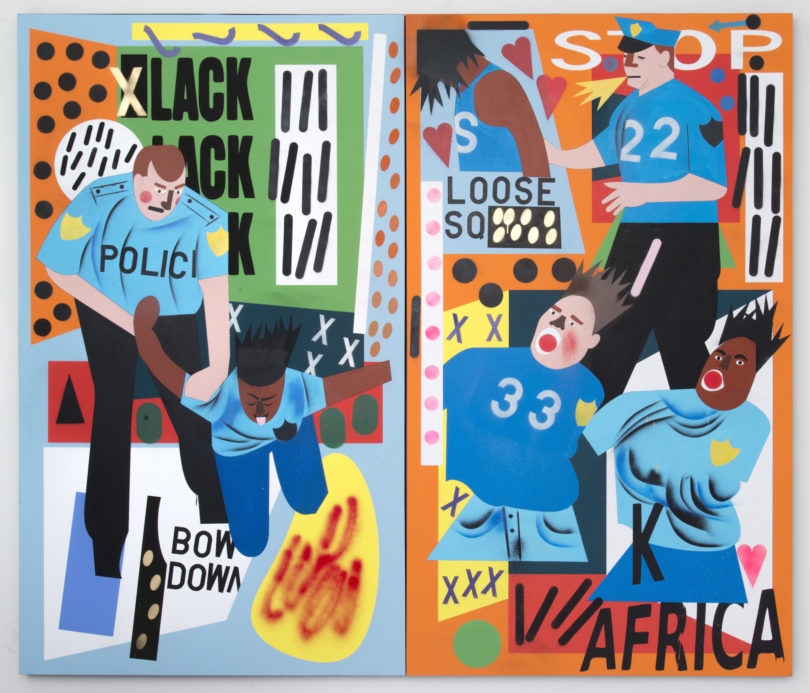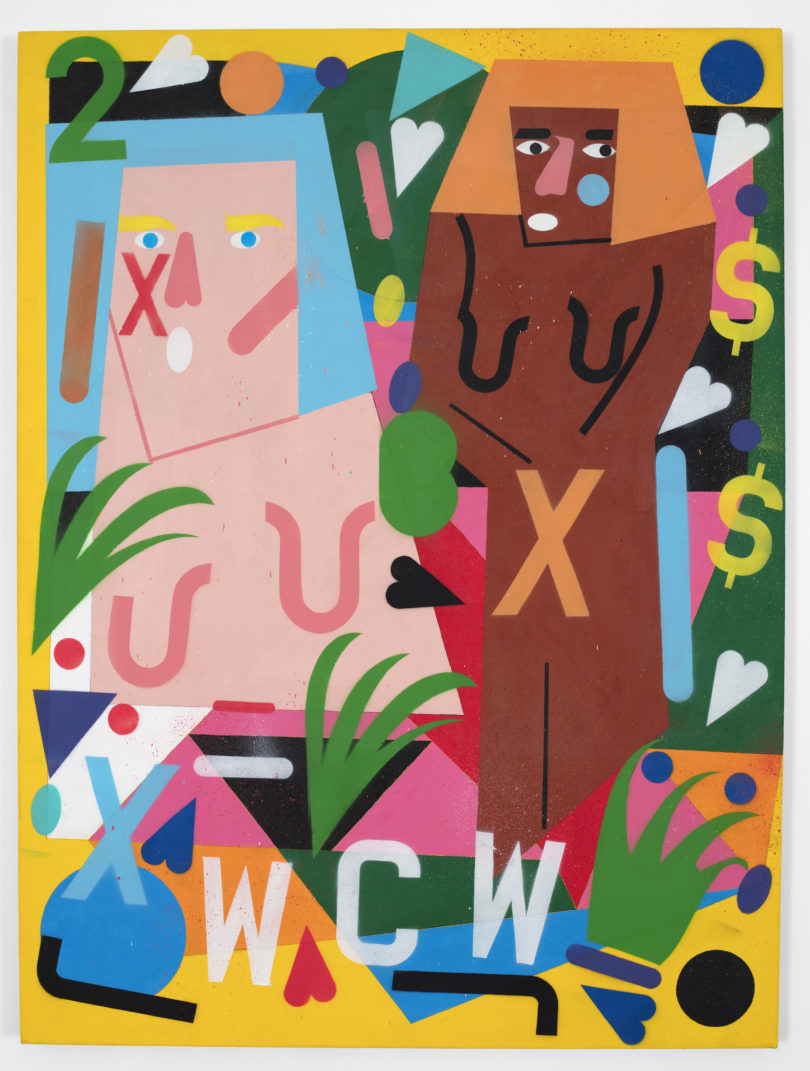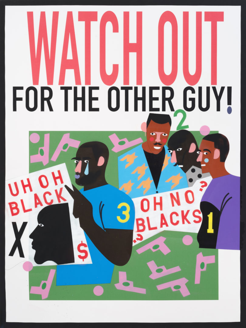 Blickt man auf die Malerei von Nina Chanel Abney fällt ein humoristischer Unterton auf, der sich je nach Lage als Sarkasmus oder knochentrockene Ironie offenbart. Ein Bild wie „Guns and Butter“, das sie 2017 in der Galerie Mary Boone zeigte, scheint sich über die Panikstufen mancher weißer Menschen bei der Begegnung mit schwarzen Männern auf der Straße („Uh-Oh Black“ – „Oh No Blacks“) lustig zu machen. Dass jedoch schwarze Männer in Amerika besonders häufig zur Zielscheibe rassistischer Gewalt werden, deutet die Künstlerin durch die Träne im Augenwinkel einer Figur an. Der Inhalt ist schwer, sein visuelles Gewand hingegen von bewundernswerter Eleganz und Leichtigkeit: „Als ich am Anfang meiner Karriere Themen wie Rassismus in meinen Werken angesprochen habe, hatte ich immer die Sorge, die Betrachter könnten vor diesen Bildern zurückschrecken oder das Gefühl haben, die Werke seien nicht für sie gedacht“, sagt Abney. „Wenn ich Humor und mehrdeutige Symbole einsetze, kann ich dagegen die Themen so präsentieren, dass sich jeder in den Bildern wiederfindet und sie von seinem Standpunkt aus reflektiert.“