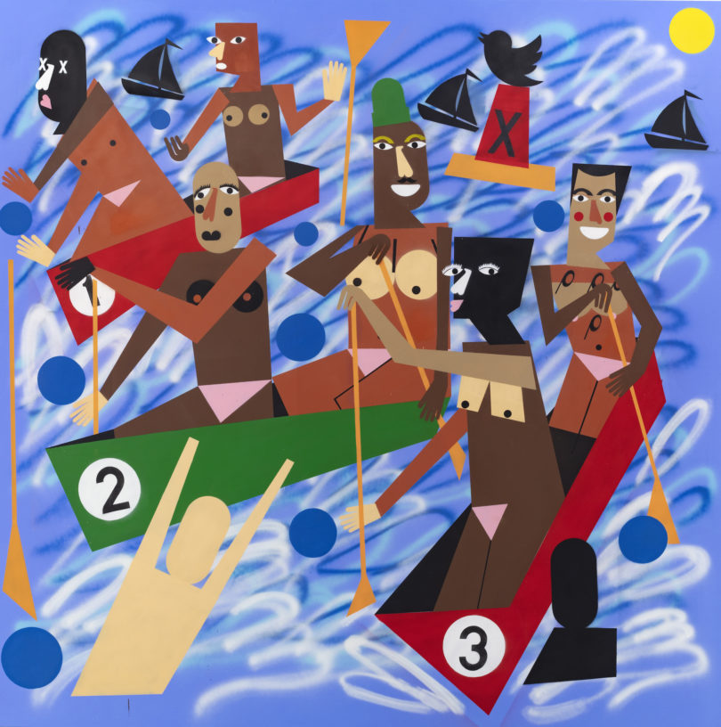 Auf mehrdeutigen Unterströmungen spielt sich auch der fröhliche Kanuausflug ab: Der Titel „Buoyancé/Seas the Day“ (2020) ist ein Spiel mit dem englischen Wort für Auftrieb (buoyancy) und der schwarzen Sängerin Beyoncé, im Hintergrund zwitschert auf
