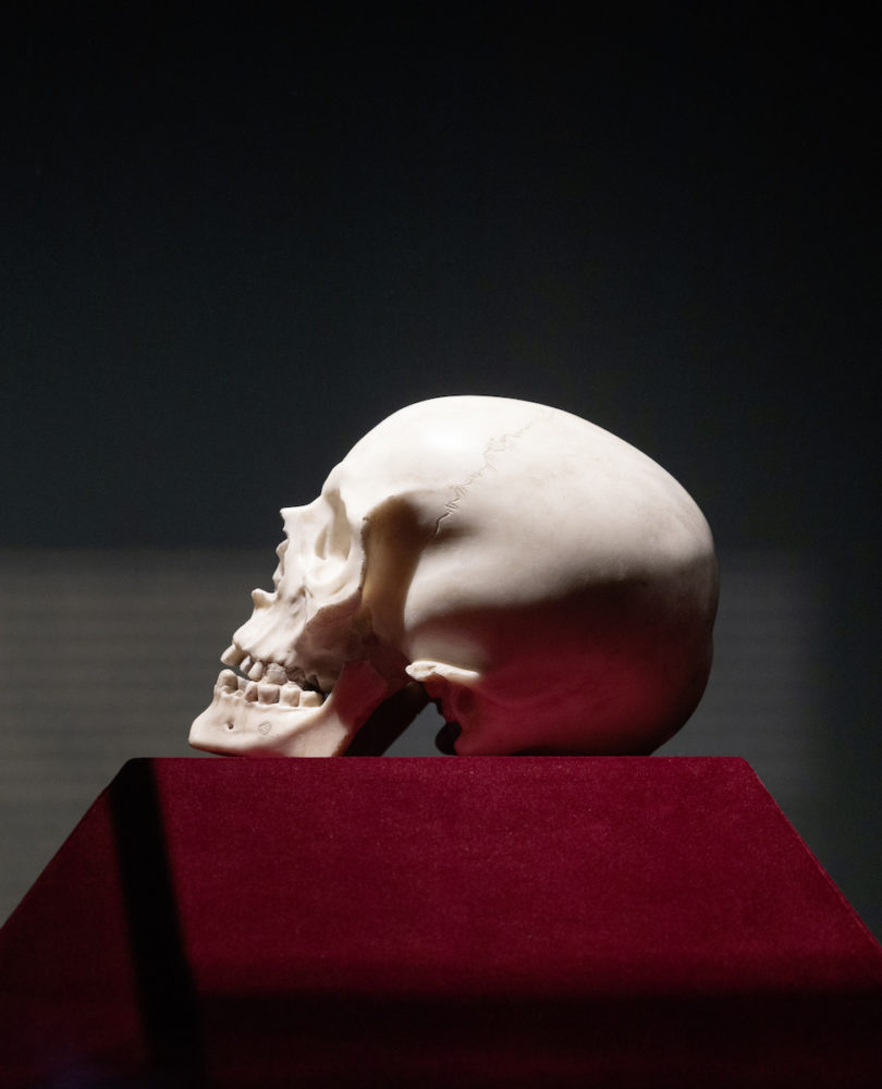 Von Lebensgröße zu sprechen, sei ja bei einem Totenschädel ein bisschen seltsam, sagt die Kuratorin Claudia Kryza-Gersch, als sie von dem Dresdner Sensationsfund berichtet. Eine unglaubliche Aura habe das Werk. Die Skulptur aus Carrara-Marmor ist realistisch bis in die Feinheiten der Zahnlücken und der Nähte an der Schädeldecke, und sogar hohl wie ein echter Schädel. Wahrscheinlich liegt es auch an ihrer täuschend echten Erscheinung, dass sie seit Jahrhunderten unerkannt in Dresden schlummerte und erst kürzlich in Schloss Pillnitz entdeckt wurde. „Aus Marmor gemeißelt, ein Mirakel“, schwärmt die Kuratorin bei der digitalen Pressekonferenz kurz vor der Eröffnung der Ausstellung „Bernini, der Papst und der Tod“ in der Gemäldegalerie im Semperbau, wo der spektakuläre Schädel in einer kleinen Kabinettschau bis 5. September präsentiert wird.