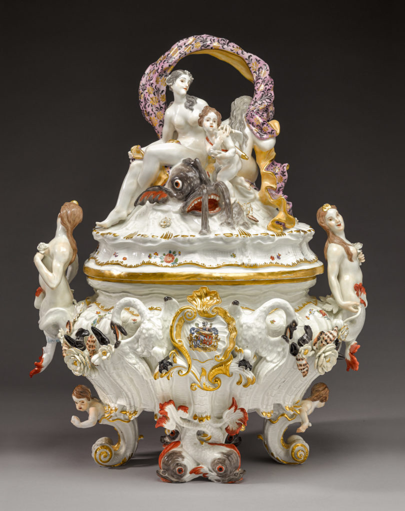 Der rund 460 Seiten starke Katalogteil enthält 240 Objekte von acht Privatsammlern. Übersichtlich in sechs Kapitel gegliedert, wiederum mit erhellenden Einführungstexten, beginnt er mit Johann Friedrich Böttger. Die über 70 Nummern unter „Johann Gregorius Höroldt“ vereinen Chinoiserien, und Fabeltier-Dekore; es folgen ostasiatische Muster wie Kakiemon und „Famille-Verte“. Die schier unerschöpfliche Phantasie Johann Joachim Kändlers spiegelt sich in rund 100 Positionen mit Figuren von der Commedia dell’ Arte über Galante Gruppen, aufwendig mit französischen Goldbronzen montierten Objekten, dem berühmten Hofzwerg Joseph Fröhlich bis zur vielteiligen „Affenkapelle“. Heinrich Graf von Brühl setzt den Höhe- und Schlusspunkt mit seinem Schwanenservice und Brühlschen Allerlei. Die 13-Nummern umfassende Schwanenservice-Kollektion dürfte übrigens die umfangreichste und damit bedeutendste in Privatbesitz sein. Überwältigend allein schon die rauschhafte Kompositon der beiden, gleichsam aus Wellen und Schaum gestalteten Galatea-Terrinen mit ihren sinnlich-eleganten Figuren, Tieren und Blumen sowie den bekrönenden, geblähten bunt und golden staffierten Schals, die als Deckelgriffe dienen. Ganz anders die Wirkung des „Brühlschen Allerlei: 1745, noch während die Manufaktur mit den letzten Arbeiten am Schwanenservice beschäftig war, gab Brühl dieses Service in Auftrag. Trotz der feinen Modellierung steht hier der malerische Dekor im Vordergrund. Als eine Vorlage der naturalistisch exakt gemalten Blumen- und Gemüsepflanzen diente der zwischen 1737 und 1745 erschienene botanische Atlas „Phytanthoza Ikonographia“ des Regensburger Apothekers Johann Wilhelm Weinmann.