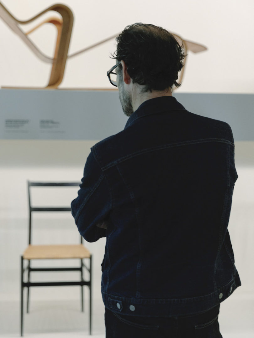 Hier stehen viele wunderbare Klassiker. „Superleggera“ von Gio Ponti ist ein Redesign eines traditionellen Stuhls aus dem 19. Jahrhundert. An der ligurischen Küste wurden damals leichte Stühle gebaut, aus Holz, sehr kleine Querschnitte, eine Rahmenkonstruktion und dann diese geflochtenen Sitze. Gio Ponti greift das auf und macht daraus einen sehr rationalen Stuhl. Das ist fast wie Flugzeugbau, mit Querschnitten, die gerade nur dort Fleisch haben, wo man das Material braucht, um die Verbindung einzugehen. Was nicht unbedingt notwendig ist, wird weggeschnitten. Der Stuhl wiegt unglaubliche 1700 Gramm.