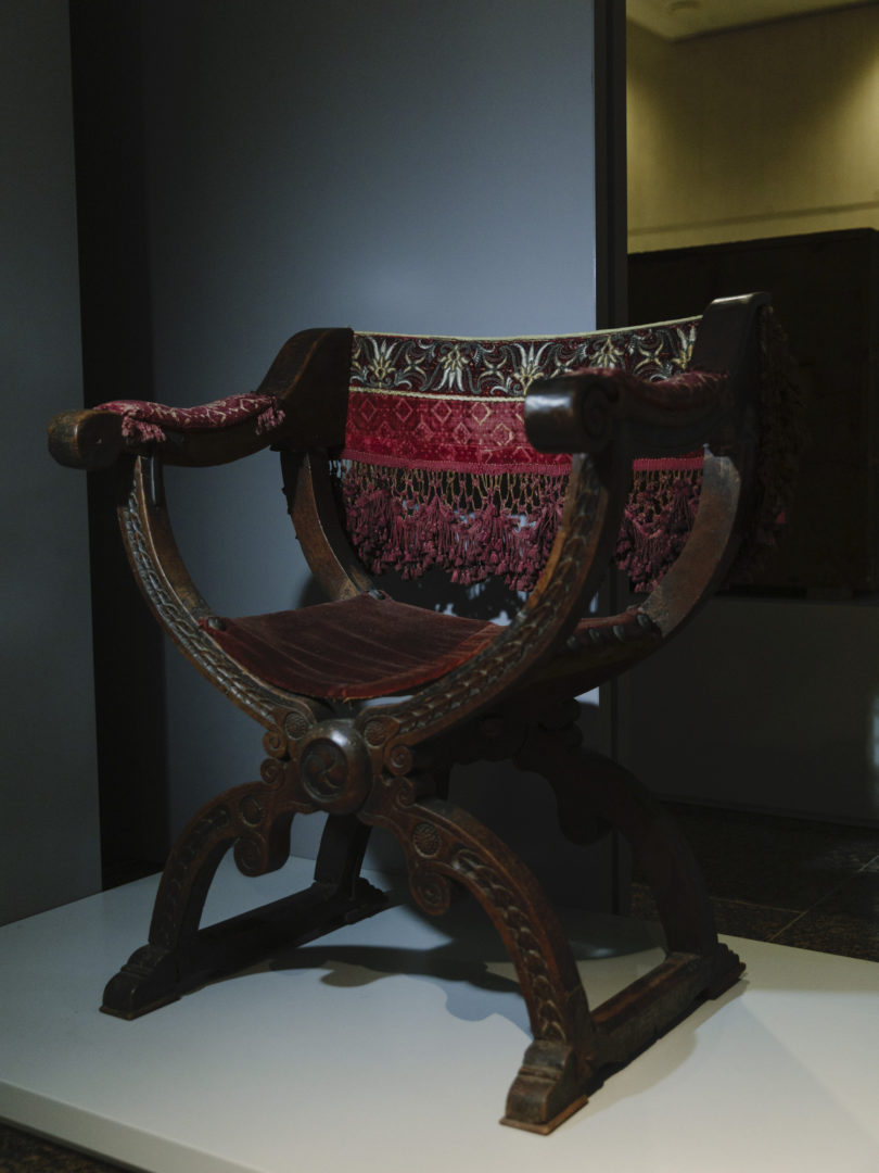 Ich frage mich: Wer saß überhaupt auf so einem Stuhl? Dieser Stuhl war ja kein gewöhnlicher Stuhl, wie Stühle es heute für Sie, für mich, für viele Menschen in vielen unterschiedlichen Situationen sind. Wahrscheinlich war die Situation, in der dieser Stuhl steht, und wer darauf sitzt, relativ klar. Ergonomiemodelle wurden damals nicht gebaut. Sie sind von einem bestimmten Sitzmaß ausgegangen, das dem Objekt eine gewisse Präsenz, eine gewisse Gravitas gegeben hat. Es ist kein Thron, aber es hat etwas Thronhaftes. Der Sitz ist weich, die Rückenlehne ist weich. Wahrscheinlich ließ er sich falten. Warum das relevant war … wurde er auf einer Reise mitgenommen? Der Klappstuhl war von der Typologie her weit verbreitet.