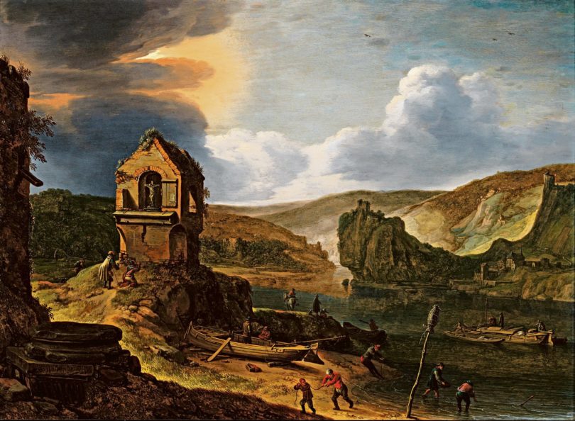 Wie vom Maler beabsichtigt, folgt der Blick von erhöhtem Augenpunkt einem gewundenen Flusslauf, der zur in kühlen Blautönen verschwimmenden Bildtiefe führt; am zuverlässig linken Ufer unterbrechen im Mittelgrund vielleicht ein reich staffiertes Dorffest, das geschäftige Treiben der Bauern oder der Arbeiter einer Hafenanlage die rigorose Führungslinie. Und weil Herman Saftleven (Rotterdam 1609 – 1685 Utrecht) die immer gleichen Kompositionsmuster besonders seiner Rheinlandschaften hinter einem mannigfaltigen Aufgebot an Detaillösungen kaschierte, bestellten seine Kunden nicht selten gleich ein passendes Gegenstück dazu, das die vertrauten Motive behutsam variierte, ohne die Fantasie des Malers oder gar des Käufers zu überfordern. Die große Zahl dieser vor allem seit den 1650er-Jahren entstandenen Arbeiten wie auch sein Verharren in den Grenzen seiner Spezialisierung sprechen eigentlich dafür, dass er nach der Orientierung an so unterschiedlichen Vorbildern wie Abraham Bloemaert, Jan van Goyen, Pieter de Molijn oder den Italianisanten Cornelis van Poelenburgh und Jan Both mit seinen dicht bevölkerten Flusslandschaften eine dauerhaft einträgliche Marktnische gefunden hatte, die wenig Raum ließ für Ausflüge in andere Themenbereiche. Daher war die Standardisierung seiner Produktion vermutlich die einzig praktikable Antwort auf die gewachsene Nachfrage.