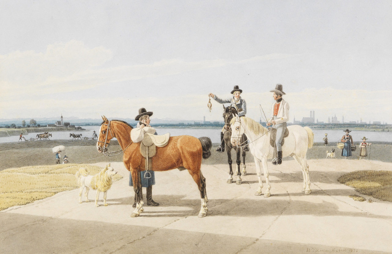 Wilhelm von Kobell, 1766 in Mannheim geboren, seit 1793 in München und anfangs wie viele der holländischen Malerei zugewandt, schuf im Auftrag Ludwigs zwischen 1808 und 1815 eine Serie von zwölf Schlachtenbildern für den Bankettsaal der Residenz zu Ehren der bayerischen Soldaten in den napoleonischen Kriegen. Doch vollzog Kobell mit Nonchalance den Umschwung zur bürgerlichen Kunst. Seine in helles Licht getauchten „Begegnungsbilder“ zeigen schier regungslose Paare oder Figurengruppen in schaubühnenartiger Landschaft. Lange Schatten werfend, bevölkern sie die Umgebung am Tegern- oder Starnberger See, oft vor der Silhouette Münchens am fernen Horizont. Die Trachten und Uniformen gab Kobell so akribisch und detailliert wieder, dass seine Bilder später als Quelle der Volks- und Kostümkunde dienten.