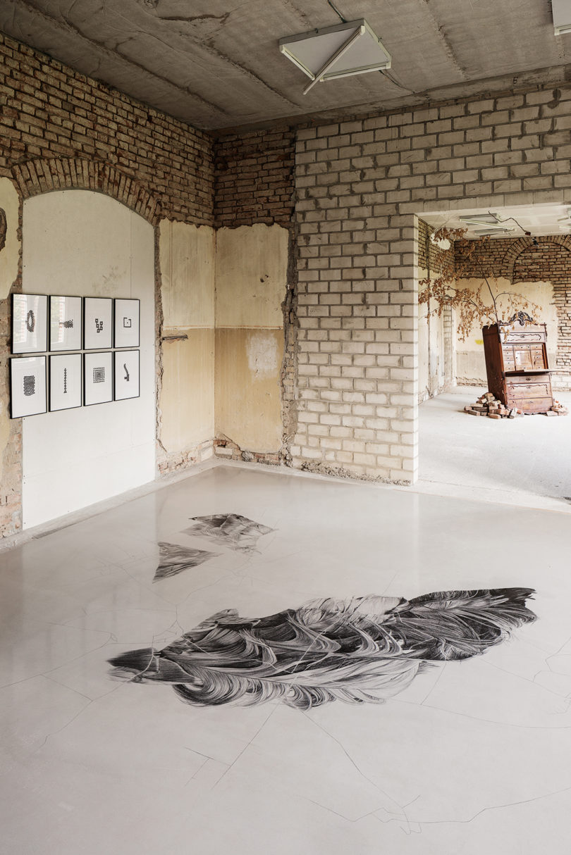 Drinnen setzt sich die Ausstellung fort. Schon im dämmrigen Entree, wo bewegte Bilder über die, natürlich unverputzten, Wände flimmern. Eine Erzählung in Fragmenten: Man sieht die Künstlerin Emma Waltraud Howes im Kranichkostüm über die nahen Felder stromern, wo sie versucht, sich den großen, schönen Vögeln anzunähern, die dort zweimal im Jahr auf ihren Flügen zwischen Schweden und Spanien rasten. Die Requisiten des Experiments – Gummistiefel, ein weißes Hemd und zwei lange Handschuhe mit Vogelköpfen an den Enden – hängen ein Stockwerk höher im offiziellen Kranich Museum und bilden die Arbeit „Kranicherziehungskostüm“. Doch die Videoprojektion „Du tust mir nichts zuleide“, in die unwillkürlich eintaucht, wer seinen Zimmerschlüssel aus dem „Safe“ genannten Briefkasten geholt hat und das Haus betritt, macht ungleich anschaulicher, wie innig Hotelbetrieb und Kunst ineinander verwoben sind. Als im Jahr 2012 das Kranich Museum eröffnete, gab es auf dem Grundstück gerade einmal ein Apartment neben der zu einem Restaurant umfunktionierten ehemaligen Schmiede. Heute gibt es im Gutshaus sechs Zimmer, zwei Atelierwohnungen unterm Dach und im ehemaligen Eishaus der Familie Hesse zwei weitere Apartments.