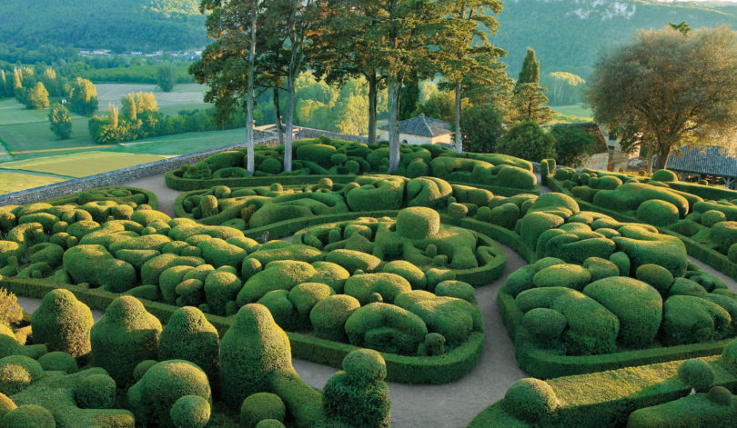 Hoch über dem Tal der Dordogne in Südwestfrankreich liegen das Schloss und der Garten von Marqueyssac. Der Besitzer Julien de Cerval liebte Buchsbäume und ließ seit 1861 Zehntausende von ihnen anpflanzen. Heute sind es 150 000, viele von ihnen über hundert Jahre alt. Sie werden zu skulpturalen Gebilden geschnitten: ein enormes, fast surreal anmutendes Pflanzenrelief. © Les jardins de Marqueyssac/Laugery-Bordeaux