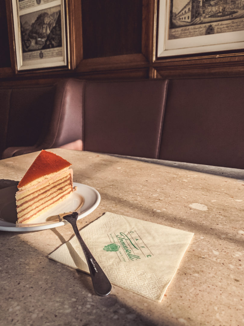 SH: Die Dobostorte, sie besteht aus Schokoladen-Buttercreme mit einem Karamelldeckel, den man abnehmen muss, sonst gibt’s eine große Schweinerei. Ich finde ja: Im Tomaselli wird einem eine Aufmerksamkeit geschenkt, die dazu führt, dass man schön in Ruhe gelassen wird. Du bist aber eher Fan vom Bazar, Nadja, oder?
