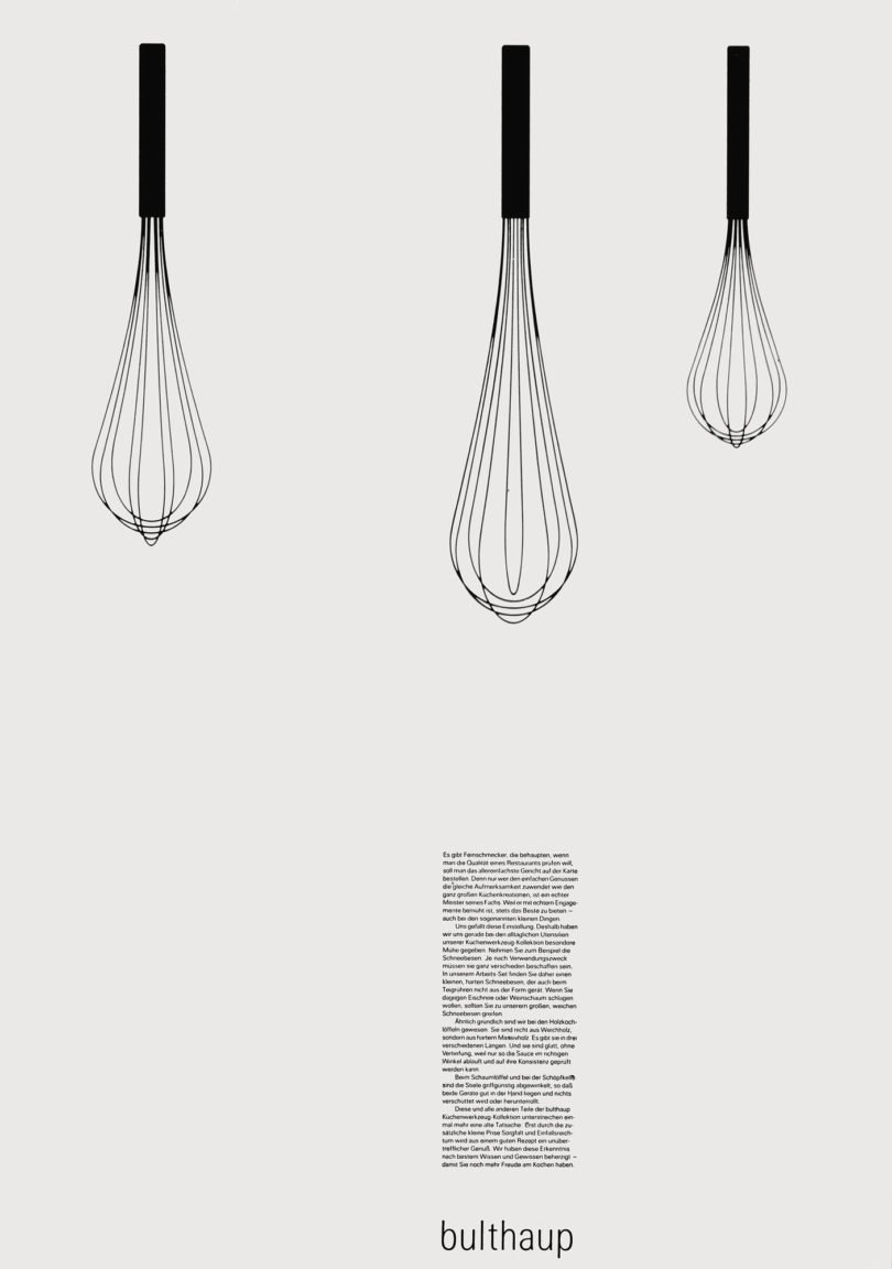 Aicher war kein Gestalter, der permanent vor einem leeren Blatt Papier saß. Er erforschte seine Umwelt und reflektierte. Im Prestel Verlag erschien zum Jubiläum „Otl Aicher: Designer, Typograf, Denker“. Der weit ausgreifende Band macht einmal mehr deutlich, wie einflussreich er war und wie aktuell sein Werk in einer Zeit der star ken Emotionalisierung von Design und nach einer Periode der Design-Gurus ist. Wilhelm Vossenkuhl beschreibt ihn als gestaltenden Philosophen, für den Denken und Machen eine unzertrennliche Einheit waren. Aicher selbst meinte gar, dass Gestalten ein Akt der Welterschaffung sei. Wer sich das zutraut, braucht analytischen Verstand. Aicher besaß ihn, wie auch seine zahlreichen Essays demonstrieren. Wenn ihn ein Thema interessierte, ging er ihm auf den Grund, etwa in dem 1982 erschienenen Buch „Die Küche zum Kochen. Das Ende einer Architekturdoktrin“. Der Anlass: Seit 1980 arbeitete er am Corporate Design für den Küchenhersteller Bulthaup. Der leidenschaftliche Koch Aicher rief in dem Essay das Ende der Landhausküchen, der kommunikationsfeindlichen Arbeitszeile und des dekorierten Regalfanatismus aus. Küchen sollten für ihn wie eine Werkstatt funktionieren: auf der einen Seite die Aufbewahrung von Lebensmitteln hinter geschlossenen Türen, auf der anderen die Reinigung und Verwahrung von Geschirr. Und mittendrin ein Arbeitsblock, das Werkzeug griffbereit und in Reichweite platziert. Über der Arbeitsplatte schwebt ein Gitter zur Aufhängung der Utensilien, eine magnetische Schiene fixiert ein ganzes Messerset. Was Aicher hier als magere Strichzeichnung darstellte, war in Rotis schon Realität geworden. Der von Aicher fürs eigene Zuhause konzipierte zentrale Küchenblock wurde zum Prototyp für die erfolgreichen Arbeitsinseln von Bulthaup. Es war der Anfang einer neuen Küchenphilosophie.