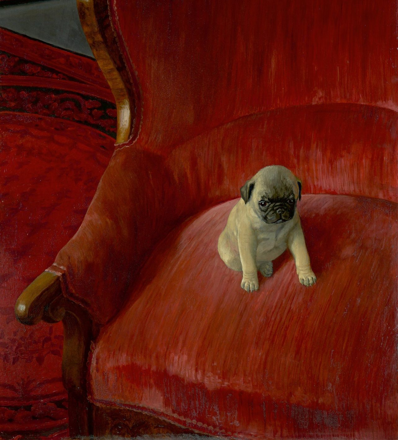 ShareVor rund 2000 Jahren wurde der Mops in Asien aus doggenähnlichen Hunden herangezüchtet. Dort galt er als Kaiserhund und war als Begleiter ausschließlich dem herrschenden Geschlecht vorenthalten. Später gelang er mit der niederländischen Ostindien-Kompanie auf europäischen Boden und auf die Schöße feiner Damen. Bald waren die Tierchen aus den Salons nicht mehr wegzudenken und fanden so auch ihren Weg in die Kunstgeschichte. Goya verewigte die Marquesa de Pontejos um 1786 mit ihrem Mops. Bei den Ritualen des Mopsordens, einem 1738 gegründeten Geheimbund freimaurerischer Prägung, kamen vor allem Porzellanmöpse zum Einsatz. Ihnen dienten die Hunde als Symbolfigur für Treue und Standfestigkeit. Auch der Leipziger Maler Thomas Theodor Heine, geboren 1867, war ein großer Mops-Fan. Er malte den kleinen „Siegfried“ im Jahr 1921. Mit nach unten gerichteten Blick sitzt er brav auf einem roten Sessel auf Samt. Wenn er nicht gerade seine Schoßhunde zu Papier brachte, arbeitete Heine als Karikaturist der Satirezeitschrift „Simplizissimus“. Wegen Majestätsbeleidigung wurde er Ende des 19. Jahrhunderts zu Festungshaft verurteilt, und später verfolgten ihn die Nazis erbittert für seine provokanten Karikaturen. 1948 starb er im Exil in Schweden.