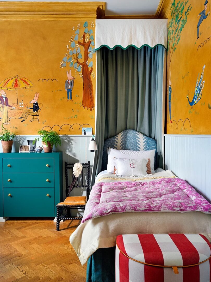 Jedenfalls ist viel zu sehen zu haben immer gut. Man kann eine ganze Wand den endlosen abstrakten Kritzeleien der Bewohnerinnen und Bewohner des Zimmers widmen, die nach und nach aktualisiert oder durch passende Werke aus der Elternsammlung ergänzt werden. Oft sind diese Frühwerke sogar spannender als die eben erwähnten Illustrationen, die es zu kaufen gibt, sie sollten am besten konsequent bis an die Decke in Petersburger Hängung arrangiert werden. Wenn schon, denn schon. In Kinderzimmern sind auch die Wände selbst als Bildträger interessant. Die Inneneinrichterin Beata Heuman hat das für ihre Kinder so gelöst, dass sie Hasenleute elegante und spaßige Erwachsenendinge an die Zimmerwände malen ließ. Vorbild waren Ludwig Bemelmans Fresken für die nach ihm benannte und schönste Bar der Welt im Carlyle Hotel in New York. Man stelle sich den ersten Besuch der (dann bestimmt schon) volljährigen Kinder in dem Etablissement vor. Aristoteles Onassis konnte Bemelmans übrigens noch selbst für die Ausgestaltung des Kinderspielzimmers seiner Yacht Christina O. beauftragen.