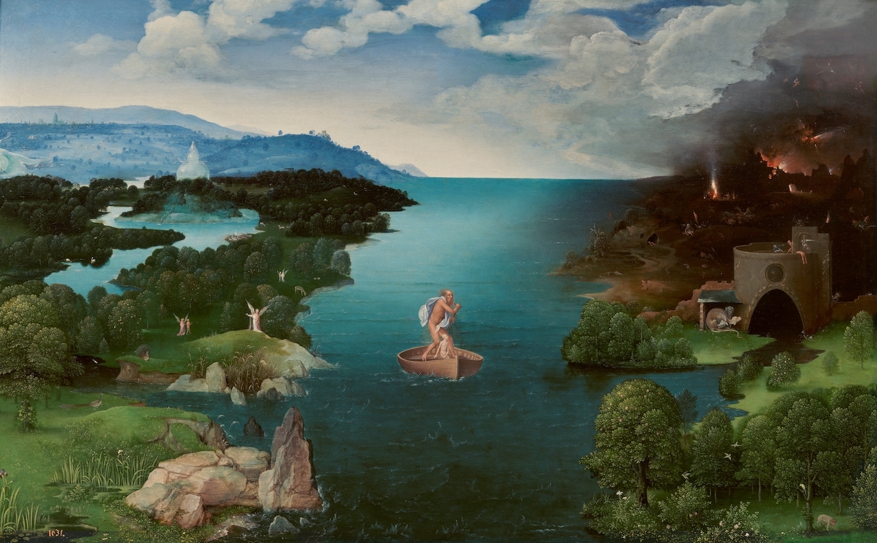 Engel, ein breiter Fluss, ein Fährmann und ein kleiner Mensch: Joachim Patinirs „Charon überquert den Styx“ zeigt den ewigen Moment zwischen Leben und Tod