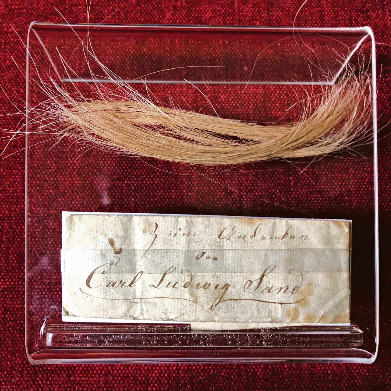Dieser hatte im Jahr zuvor den im Milieu der Liberalen verhassten Schriftsteller und russischen Generalkonsul August von Kotzebue 1819 ermordet. Sand wurde als Märtyrer und Volksheld verehrt, seine Hinrichtung war ein skurriles Spektakel. Bei Thomas Nipperdey kann man nachlesen, wie sehr die Hinrichtung als heldenhafter Märtyrertod inszeniert und sofort verklärt wurde. Die Menge schluchzte und tauchte Tücher in das Blut und versuchte, die abgeschnittenen Locken oder auch Späne vom Gerüst zu erhaschen. Der Henker, ein Pfälzer Demokrat, baute aus dem Holz des Schafotts in einem Heidelberger Weinberg ein Gartenhaus, in dem dann eine geheime Burschenschaft tagte. Um Sand entwickelte sich ein regelrechter Opferkult mit einer Vielzahl von Reliquien, die der katholischen Kirche alle Ehre gemacht hätte. Eine davon lag vor uns. Wir suchten einen Rahmen und zeigten die Locke in meiner kleinen Ausstellung.