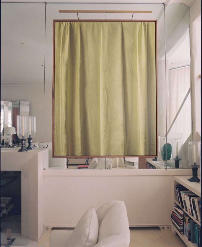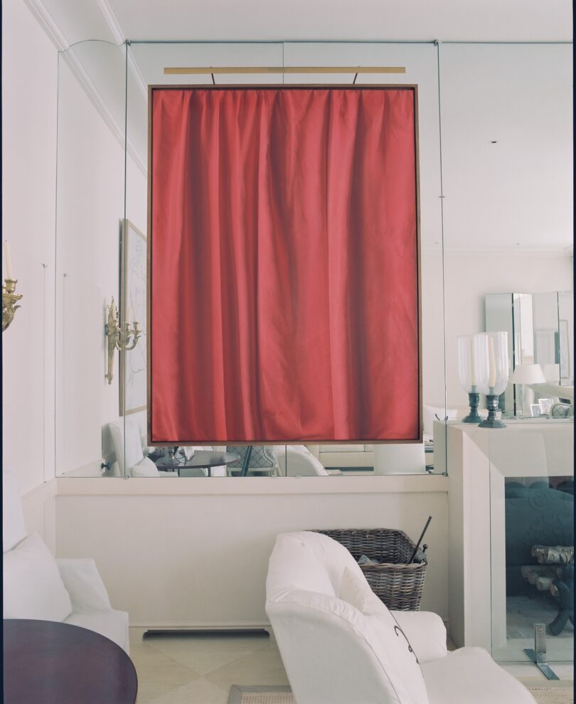 Schluss aber nun mit den bildungsbürgerlichen Kalauern, kommen wir zum Ratgeberteil. Wenn also Räume zu schwach oder zu stark werden, empfehlen wir den großflächigen Einsatz von Spiegeln. Wo sich die Dinge des Lebens ansammeln, also in Wohnungen von Menschen, die nicht in Magazinen leben, wo es mit der Zeit ein bisschen zu biedermeierlich oder trutschig geworden ist, wird es mit Spiegeln auf der Stelle souveräner und cooler. Was zu starr ist, wird gebrochen. Dabei muss es bei Spiegelwänden nicht um das eigentliche Abbild des Raumes gehen. Sie ergeben den unendlichen und immer kontrastreichen Hintergrund für Bilder, die man darauf hängt— oder für die Nachricht am Morgen danach. Über Türen und in Fensterlaibungen ergeben Spiegel schöne Licht- und Raumspiele. Vor Kurzem besuchten wir einen Freund in England, der in dem kleinen Badezimmer bei sich zu Hause aus Platzmangel das Waschbecken vor dem Fenster installiert und einfach den unteren Teil des dort üblichen Schiebefensters verspiegelt hatte. So hat man die Chance sich einfach wegzuschieben und in den Garten zu schauen beim Zähneputzen. Übrigens funktioniert der Spiegel auch als Statthalter für Kunst: Jeder Spiegel ist besser als ein doofes Bild.