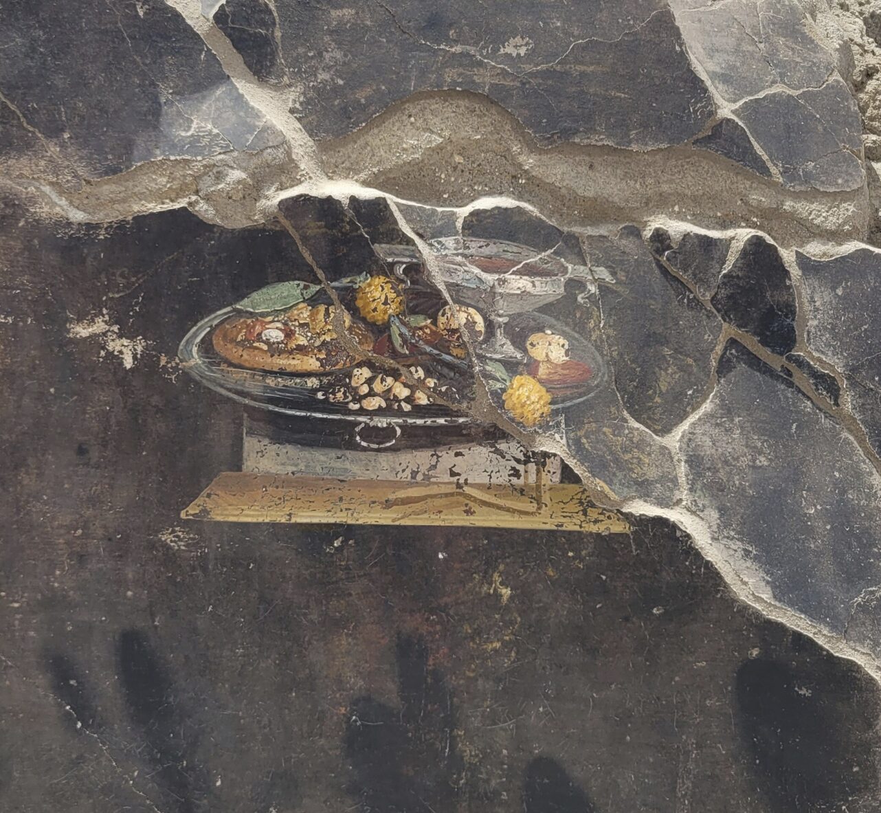 Auf dem Bild ist den Archäologen zufolge ein Fladenbrot zu sehen, das wohl als Unterlage für verschiedene Früchten diente. Der flache Teig mit einem Belag ähnelt auf den ersten Blick der heutigen Pizza. Und nach einer ersten Analyse der Forscher könnte es sich bei der Darstellung an der Wand eines antiken Hauses um einen entfernten Vorgänger der heutigen Pizza handeln, wie der Archäologiepark am Dienstag mitteilte.