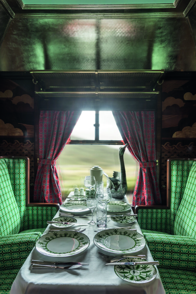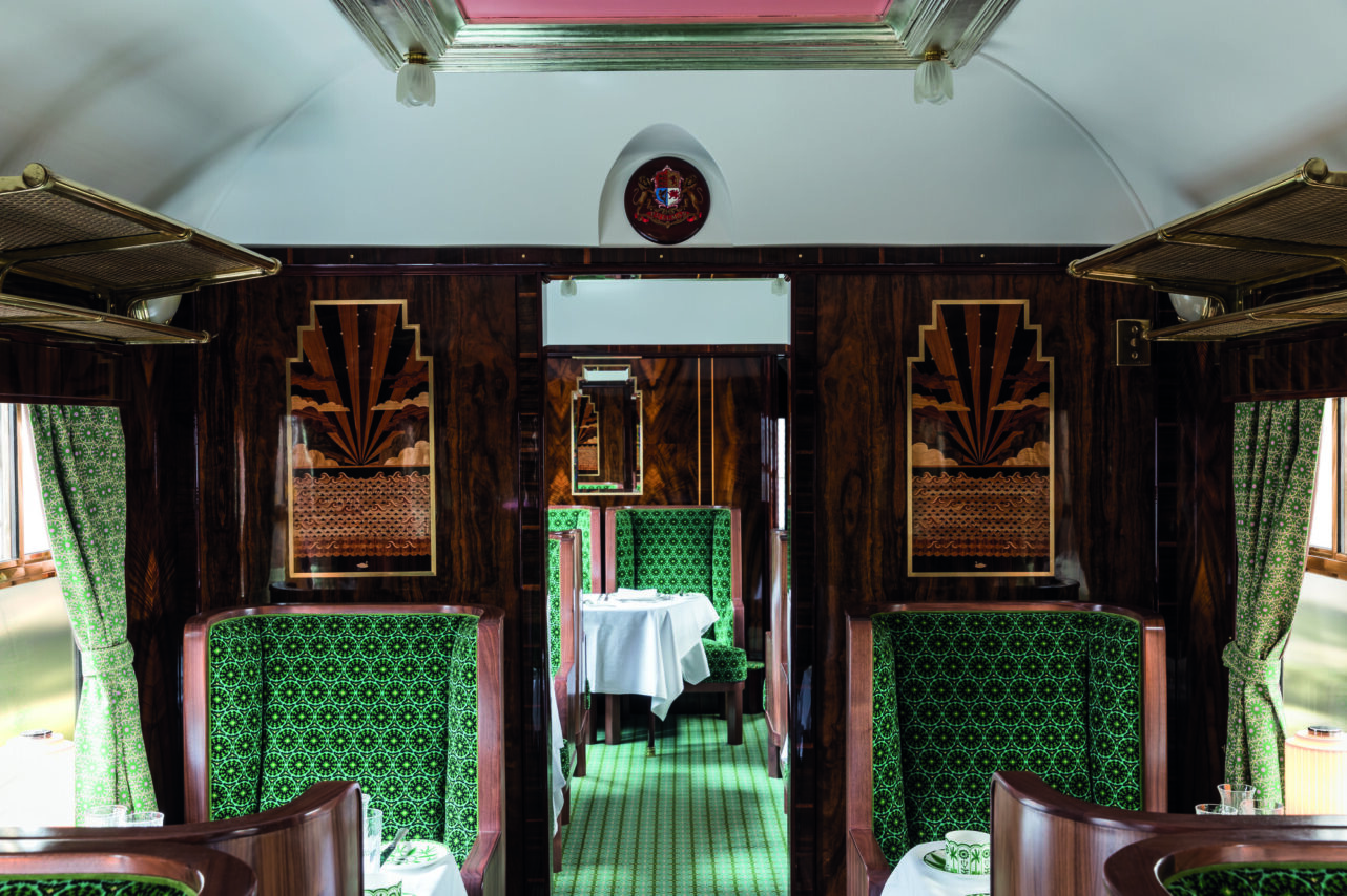 Wenn auf dieser kleinen Liste schon nicht der Orient Express auftaucht (es gibt inzwischen ohnehin zu viele davon), dann sei wenigstens Agatha Christie erwähnt. Die Schriftstellerin, gespielt von Vanessa Redgrave, fährt in dem Film „Agatha“ von 1979 im „Cygnus“, einem Wagon des heutigen British Pullman, der zur Belmond-Flotte gehört, die wiederum vom Luxuskonzern LVMH einverleibt wurde. Das erklärt, weshalb die sechs Züge, obwohl sie alle unterschiedlich aussehen, doch irgendwie alle gleich sind. Aber es gibt eben den „Cygnus“-Speisewagen, der so überbordend exzentrisch ist mit seinem Blattsilber an der Decke, seinen Mustern, Intarsien und Textilien, dass er aussieht, als hätte Wes Anderson ihn gestaltet. Hat er auch.
