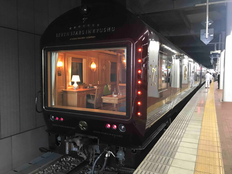Außen sieht der Seven Stars aus wie ein Erdwurm, innen ist er ein Himmel mit Aussicht. Fürs Gucken hat man jedenfalls genug Zeit. Die bummelante Fahrt über Kyūshū, die kleinste der japanischen Hauptinseln, dauert nämlich vier Tage. Dreißig Passagiere dürfen mitkommen, sich im Jupiter-Restaurant bekochen lassen und aber bitte vorher im handbemalten Waschbecken die Hände waschen. Und wiederum nur zwei können die Deluxe-Suite mit dem rückwärtigen Panoramafenster belegen. Es ist übrigens die Deluxe-Suite „A“. Bitte bei der Buchung angeben. Wobei „Buchung“ möglicherweise nicht ganz zutrifft, denn die Zuggesellschaft hat eine Lotterie eingerichtet. Zu viele wollen mit.