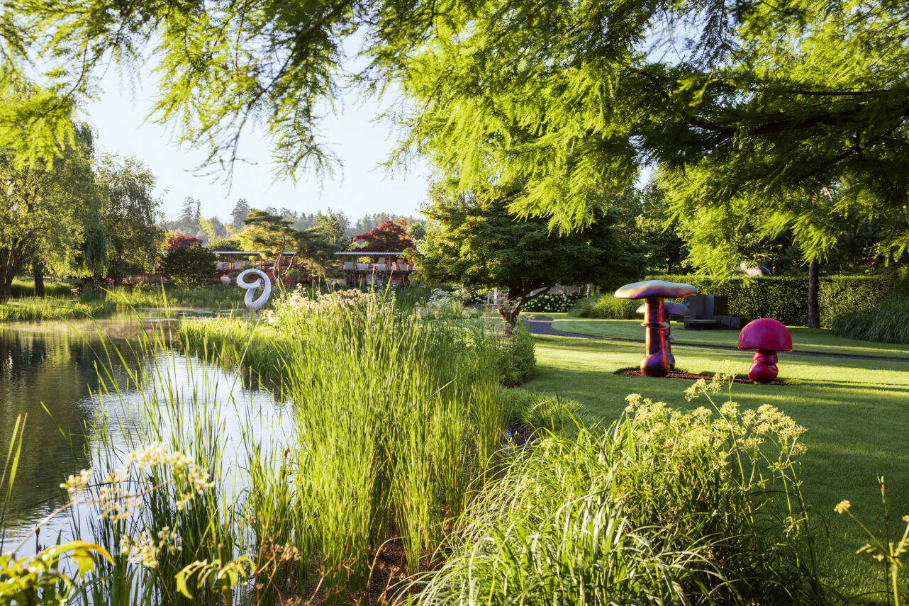 Dies tun sie seit über einem Jahrzehnt in seinem Baummuseum. Über 50 Exemplare aus gemäßigten Klimazonen verteilen sich über den Park, ein sorgsam abgezirkelter Bereich auf dem Gelände seines Unternehmens. Das Pleinair-Museum hat die Form eines Ovals, die Inspiration dazu lieferte die olympische Laufstrecke. Bei Enea muss jedoch niemand rennen. Stattdessen soll der gestresste Städter eine halbe Fahrstunde von Zürich entfernt entschleunigen; soll über die sanft geschwungenen Buchsbaumhecken, die die Bewegung der Landschaft nachahmen, ins Weite schauen, das sanfte Plätschern von Wasser genießen und nicht zuletzt die räumlichen Qualitäten der Anlage entdecken. Der Begriff Museum ist tatsächlich nicht dem Alter der Bäume geschuldet, sondern bezieht sich auf die sanfte Inszenierung aller landschaftlichen Elemente.