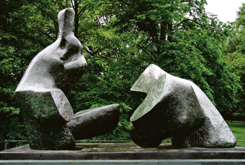 Angefangen hat alles zweifellos mit dem „Gottvater“ Henry Moore. Um seinen Werken zu begegnen, kann man beispielsweise an Gospel Oak Station in Nordlondon starten – am Fuß der Hügel von Hampstead und Highgate (Gemeinden, die irgendwie nie ganz ihren historischen Charakter als Dörfer vor den Toren der Hauptstadt verloren haben). Verlässt man den kleinen Bahnhof, spaziert vorbei am Art-déco-Freibad in das Parkland und steigt – vorbei an Tümpeln, Teichen und russischen Millionärsvillen – hügelan in Richtung Kenwood House, fühlt man sich bald fern der Metropole. Man glaubt, man sei irgendwo in der englischen Countryside. Und wenn man sich vor Kenwood House dann wieder stadtwärts wendet, eröffnet sich – Kontrastprogramm! – das ganze futuristische Panorama der City. Mit der Gherkin, dem Walky Talky, dem Cheesegrater, dem Shard – und wie die Hochhäuser alle heißen. Hochgezogen aus Beton und Glas im Verlauf der letzten zwanzig Jahre – und doch schon Zeugen einer irgendwie optimistischeren, einfältigeren Vergangenheit.