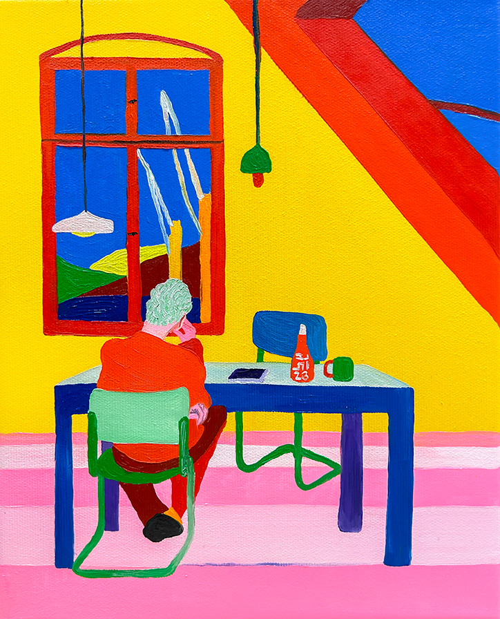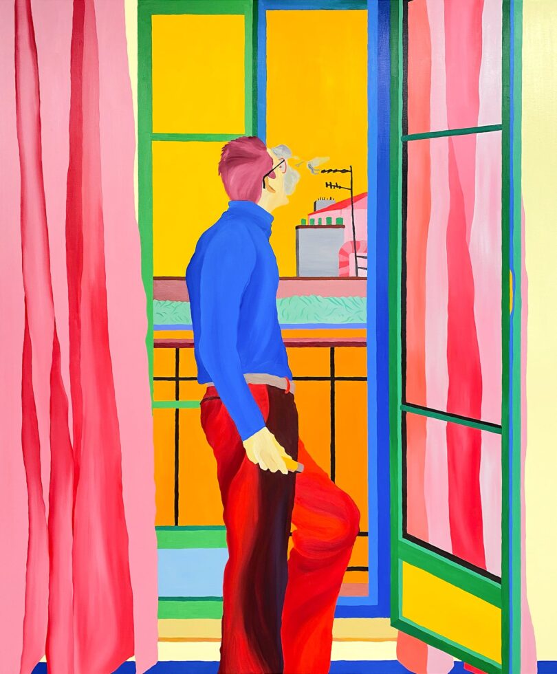 Ich weiß heute noch, wie es aussieht, dieses Bild: Ein junger Mann steht vor einem jener bodentiefen Pariser Fenster und raucht. Sein Gesicht ist zur Seite gedreht. Die Vorhänge sind in flächigen Rosatönen gemalt, die Kleidung des Mannes in strahlendem Rot und Blau, die Fenster in Grüntönen, Ultramarin und Hellblau. Der Himmel ist gelb. „Robert raucht in Paris“ (2021) fängt die Intimität eines bestimmten Moments ein. Es hält jene Sekunden während eines Gesprächs fest, in denen sich jemand abwendet, um einen Zug von der in diesem Fall elektronischen Zigarette zu nehmen. Seine erlöste Farbigkeit und sein Drahtseilakt zwischen Abstraktionswillen und Realismus erinnern entfernt an die Kalifornienbilder von David Hockney. Wenn man es anschaut, verspürt man aus irgendeinem Grund den Wunsch, dass die ganze Welt so aussehen sollte wie dieses Bild.
