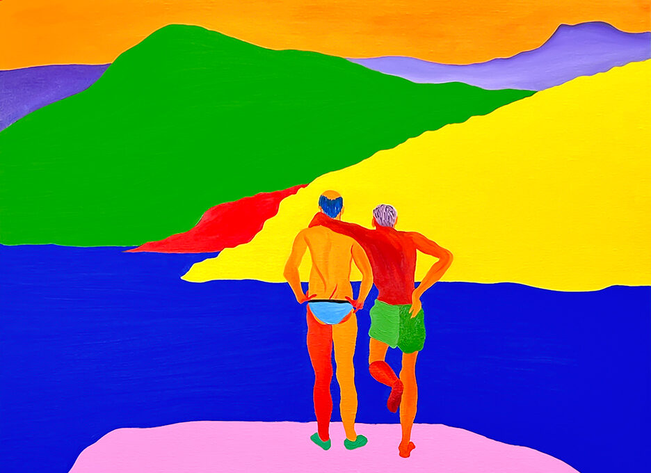 Die Bilder mit ihrer ureigenen, selbstvergessenen Farbigkeit hatten immer etwas Prosaisches und nahmen mich trotzdem gefangen: Junge Männer unterhalten sich darin in Badehosen am Strand oder am Swimmingpool, kommen aus dem Wasser und trocknen sich ab. Zwei Freundinnen sitzen sich schweigend an einem Tisch gegenüber. Ein Mann liegt nach dem Sex nackt auf einem Hotelbett und schaut auf den Bildschirm seines Telefons. Ein anderer steht, nur ein großes Handtuch um die Hüften geschlungen, in einem Türrahmen. Eine junge Familie in Sommerkleidung sieht sich ein Pferd auf einer Koppel an. Ein älteres Paar umarmt sich auf einem Balkon. Die Szenen halten Momente fest, die im Leben meist dem Vergessen anheimfallen und in denen sich dennoch der Großteil der Schönheit unserer alltäglichen Erfahrung verbirgt. Unmerklich erhöhen sie diese Momente, geben ihnen ein bestimmtes Gewicht, eine emotionale Dichte, die man oft übersieht, wenn man sie durchlebt.