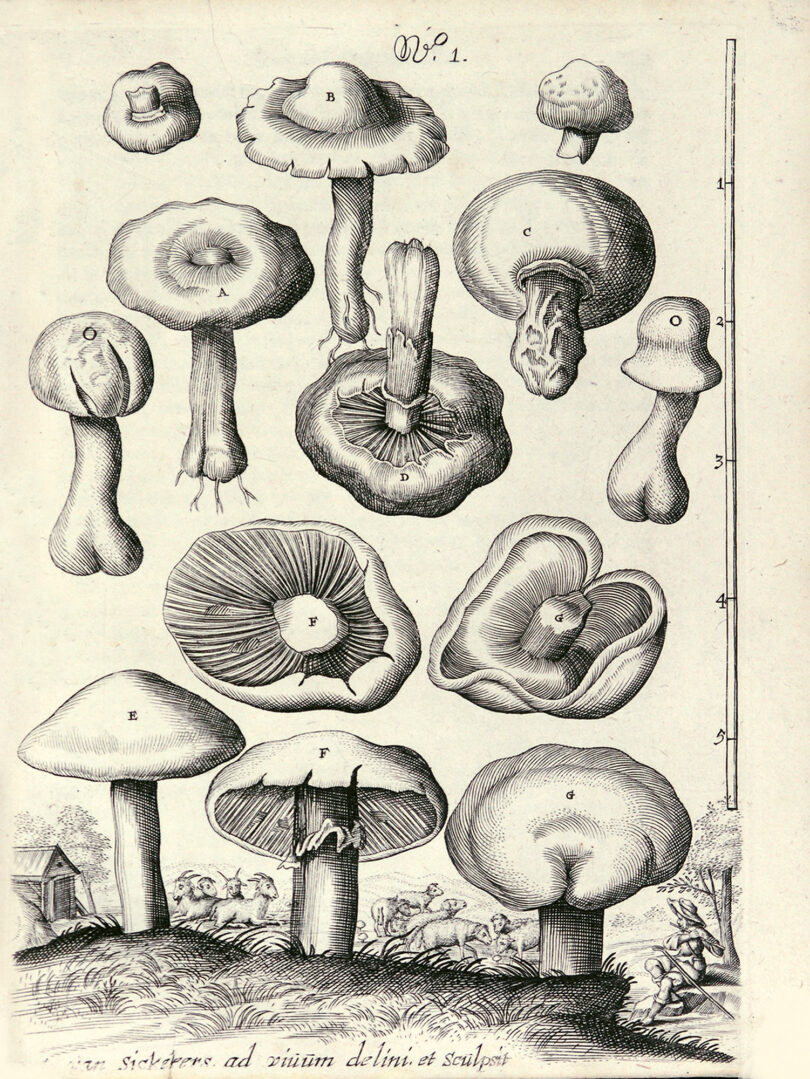 Behalten hat der Antiquar alle seine Trüffelbücher, viele wichtige und schöne Werke auch aus dem 19. Jahrhundert und alle älteren Werke, etwa den Wiegendruck der ersten italienischen Ausgabe der Naturgeschichte des Plinius von 1481, und die früheste gedruckte Pilzdarstellung, die vor uns auf dem Tisch liegt, ein Holzschnitt aus dem Hortus Sanitatis, Ausgabe 1491: In den überkreuzten Stielen der Pilze auf dieser Abbildung erkennt er seine Initialen CV und hat sie zum Logo seiner Bibliografie und seines Exlibris gemacht. Er ist stolz darauf, dass die umfangreiche Bibliografie seiner Sammlung längst die internationale Standardreferenz für die ältere Pilzliteratur ist. Er hat sie auch als Luxusausgabe mit historischen Originaltafeln herausgebracht, und man muss nicht lange rätseln, woher wohl die Tinte kommt, mit der die Exemplare nummeriert sind.