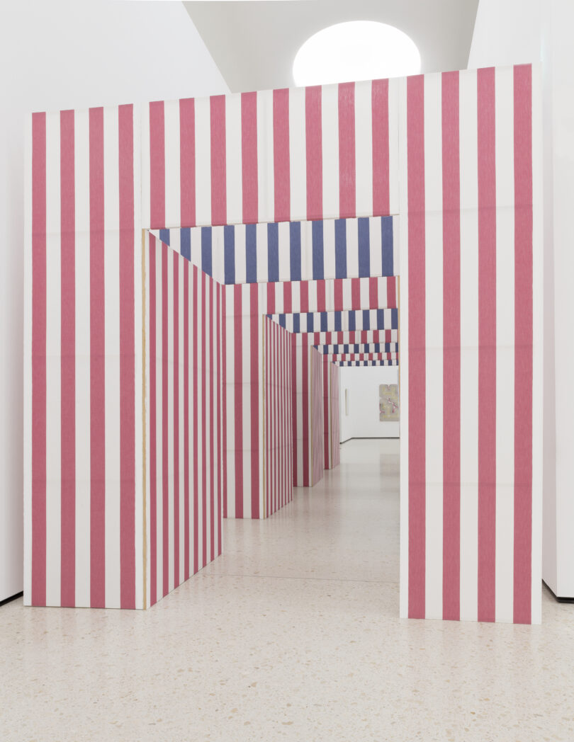 Am häufigsten werden Streifen als Dekorationselement also mit den mittelalterlichen Kirchen in Nord- und Mittelitalien in Verbindung gebracht. Diese italienische Tradition inspirierte das von John Ruskin gefeierte und seinen Zeitgenossen so geliebte polychrom gestreifte Mauerwerk der viktorianischen Architektur sowie seine Verwendung in der postmodernen Baukunst, vor allem bei James Stirling und Mario Botta. Im Innenraum geliebt, sind Außenstreifen an Fassaden immer noch eine Provokation für die mönchskuttige Nachbarschaft. Adolf Loos‘ Haus für Josephine Baker wurde nie gebaut. Madonna durfte sich mal wieder einiges anhören, als ihr Designerbruder Christopher Ciccone ihr Haus am Mullholland Drive gestreift anmalen ließ – wahrscheinlich auch, um einen der Vorbesitzer zu überschreiben: den brutalen Mobster Bugsy Siegel. Der Streifen als friedvolles Camouflage.