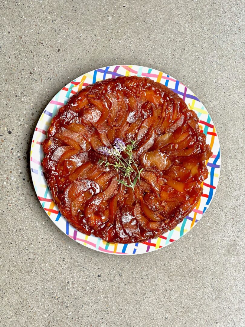 Der Effekt der gestürzten Tarte kann mit Hinterglasmalerei verglichen werden: Die erste Malschicht ist diejenige, die man zuoberst sieht. Die Tarte nach Geschmack mit frischen Lavendelblüten dekorieren, und noch warm servieren, wer mag mit einem Löffel Crème fraiche.