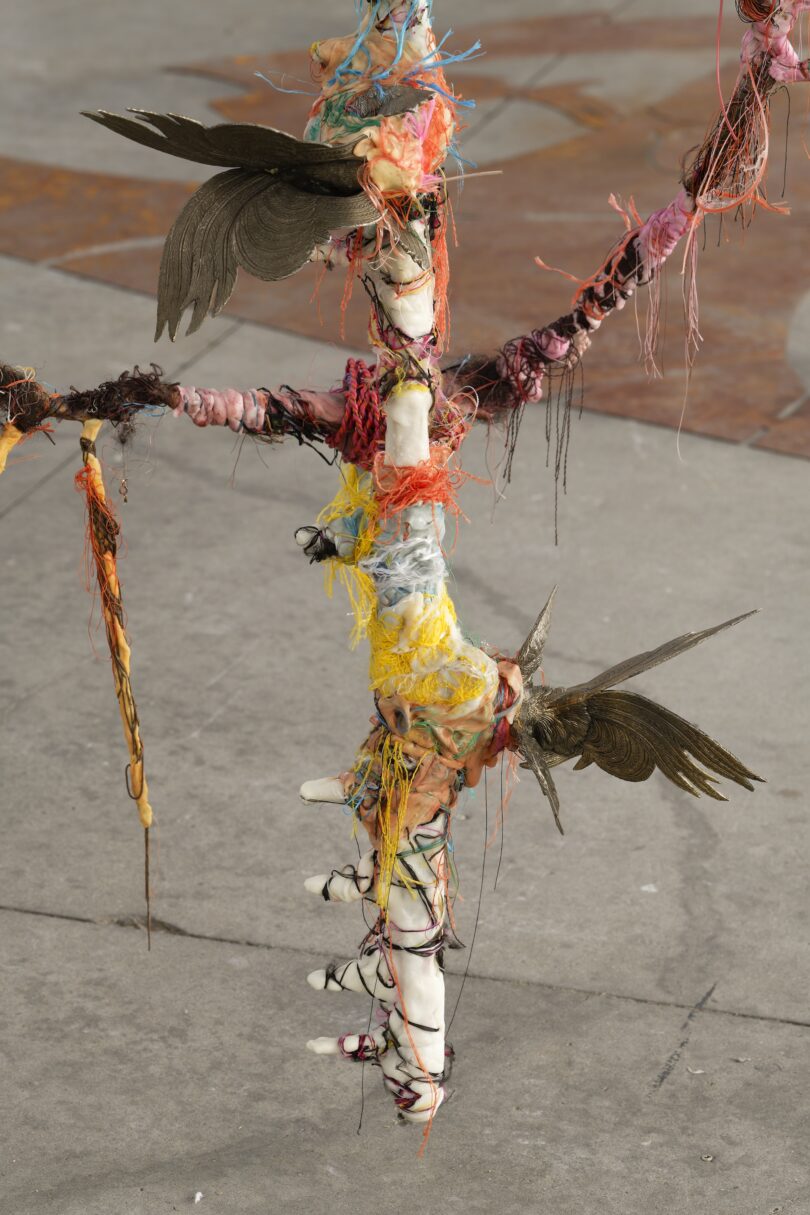 Das Meer, das uns trennt, das Meer, das uns verbindet: Diese Grundidee für die Biennale stellte Julien Creuzet wenige Wochen vor der Eröffnung der Kunstschau auf Martinique vor. Um die Karibikinsel, wo er aufwuchs, kreist seine Arbeit („Oh téléphone, oracle noir…“, 2023) mit performativen und sprachlichen Elementen.