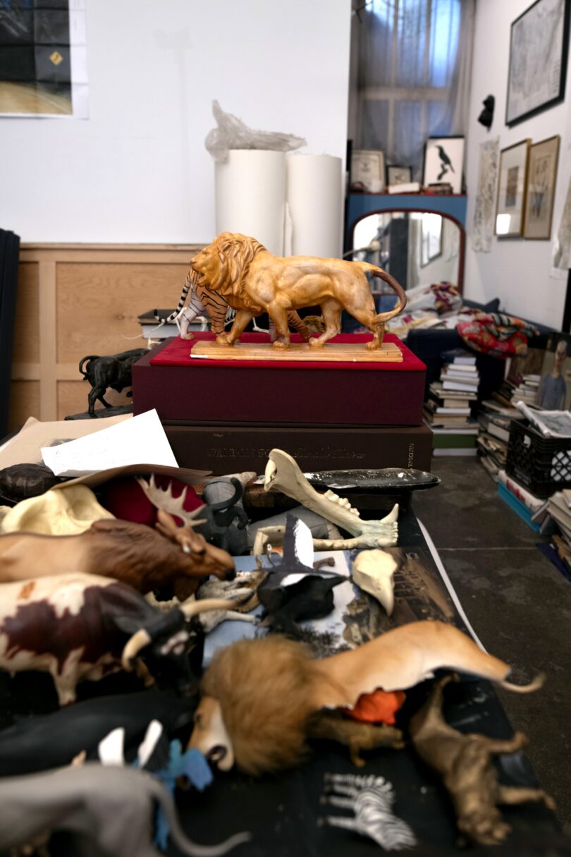 Die Aufzählung könnte noch lange weitergehen, denn es sieht aus, als hätte ein Orkan den Inhalt eines Naturkundemuseums und einer Bibliothek durcheinandergewirbelt. An der linken Wand leuchtet, flankiert von zwei kleineren Bildern, ein rund drei Meter breites gelbes Aquarell mit einem Löwen in Lebensgröße. An der rechten Wand hängt eine Rattenzeichnung von George Grosz, und Bücherstapel türmen sich vor übervollen Tischen mit Farbtuben und Tierskeletten auf.