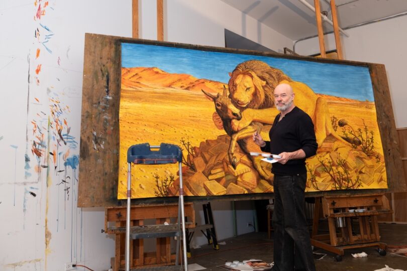 Zwischen einem Rennrad, einer Büste der Nofretete und drei bunten Dürer-Plastikhasen – eine Edition von Ottmar Hörl – gibt es eine Sitzecke. Walton Ford schiebt ein paar Papiere von den Polstermöbeln, sodass wir uns hinsetzen können, um über seine kommende Ausstellung zu sprechen. In wenigen Wochen beginnt in Venedig zeitgleich zur Biennale seine Schau „Lion of God“, kuratiert von Udo Kittelmann, mit dem er schon bei seiner großen Berliner Ausstellung „Bestiarium“ im Jahr 2010 zusammengearbeitet hat. Für den neuen Zyklus hat er die Werke geschaffen, die jetzt das Chaos im Atelier dominieren.