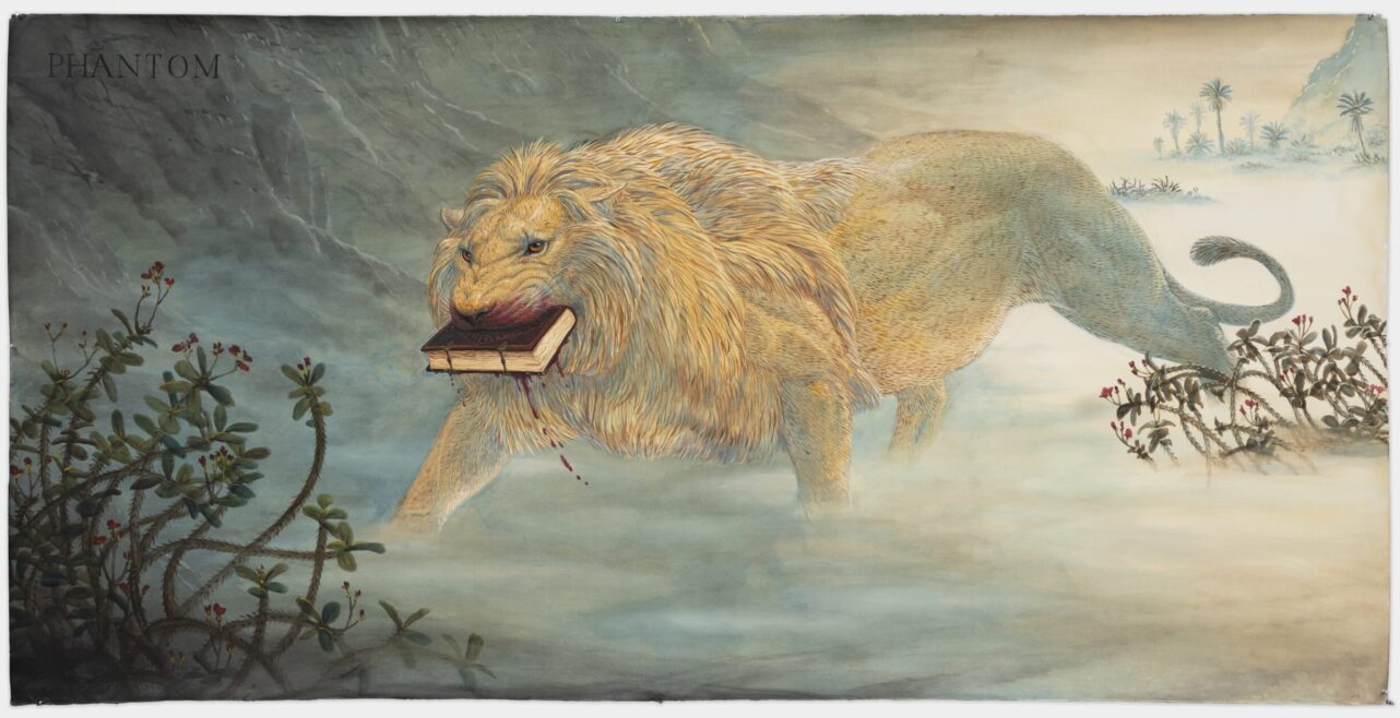 Der Künstler erzählt weiter, wie der Löwe der Legende nach einen Esel auf der Weide hütete, aber eines Tages in der Hitze einschlief und der Esel gestohlen wurde. Nun verdächtigten Hieronymus und die Mönche ihn, das Lasttier gefressen zu haben, und zur Strafe musste ab jetzt der Löwe die Arbeit des Esels verrichten und das Brennholz tragen. „Das Raubtier wird gezähmt und gedemütigt, es wird zum Lasttier.“ (Der englische Ausdruck beast of burden, den Walton Ford benutzt, klingt noch dramatischer als die deutsche Übersetzung, und man hat sofort den gleichnamigen Song der Rolling Stones im Ohr.) Schließlich findet der Löwe den Esel wieder, vertreibt die Diebe, bringt ihn nach Hause und wird wieder in die Gemeinschaft aufgenommen.